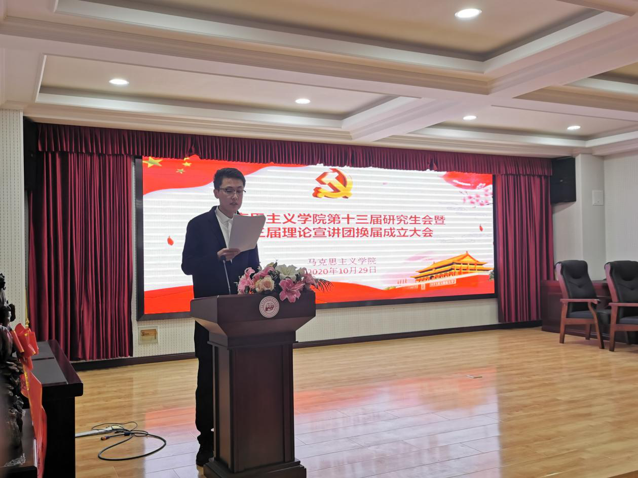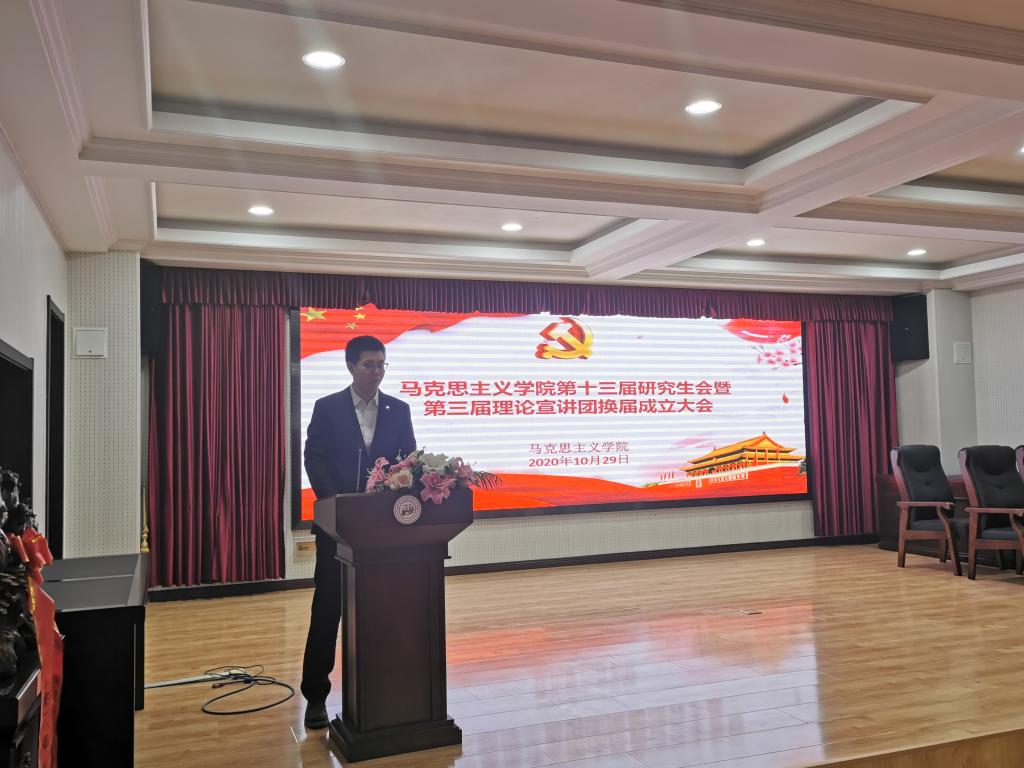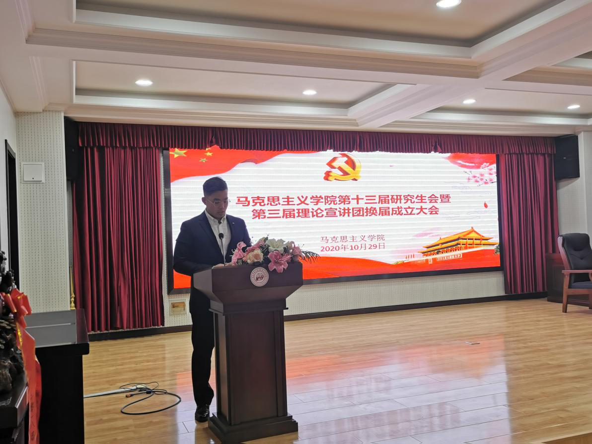 2020年10月29日下午,bevictor伟德官网在报告厅举行第十三届研究生会暨第三届理论宣讲团换届成立大会。马克思主义公司党总支书记张鸣、经理曹胜、副经理张运君,bevictor伟德官网第十二届研究生会主席团成员、各部门部长,第十三届研究生会全体成员以及习近平新时代中国特色社会主义思想宣讲团全体成员参加活动。本次活动由2020级韩新怡主持。