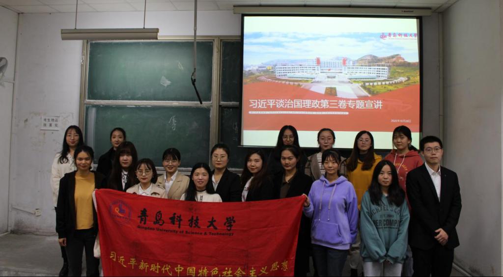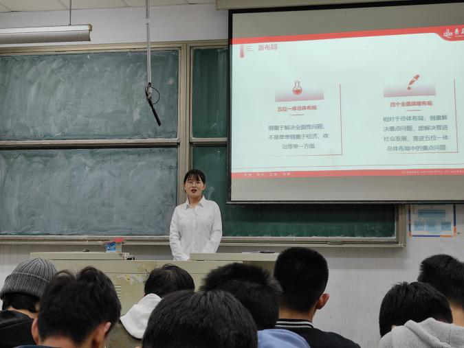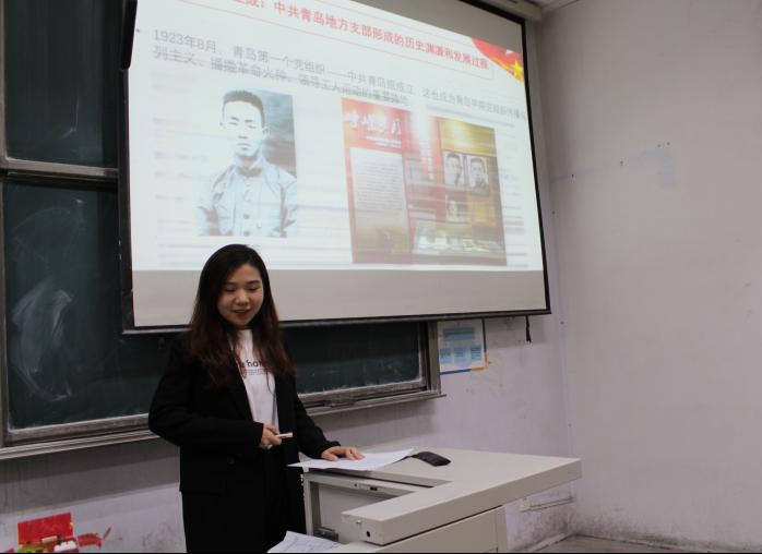 吴喆蕾以《六个“新”解读<习近平谈治国理政>第三卷》为题,讲述了新时代的新特点;社会主要矛盾出现了新的重大转化;“五位一体”总体布局、“四个全面”战略布局的新布局;社会主义现代化强国的新目标,基于新目标提出的新要求,作为实现中华民族伟大复兴中国梦坚实基础的新气象。青年兴则国家兴,青年强则国家强,邵冉以《弘扬爱国精神,不负伟大时代》为题,以帝吧网友、饭圈女孩为例,讲述了青年人的担当与责任,积极倡导广大青少年承担起自己的责任,不负伟大时代。文化是一个国家、一个民族的灵魂,赵东青以《寻觅历史长河,发扬文化事业》为题,讲述了中华优秀传统文化、革命文化和社会主义先进文化三者的丰富内涵,提出在中国特色社会主义伟大实践中坚持中国文化发展的正确方向,在文化自觉基础上不断增进文化认同、坚定文化自信。最后韩新怡以《共忆建党岁月——从中共青岛地方支部的创建中感受党的初心》为题,回顾了中共青岛建党的历史过程,解读党的初心与使命,勉励广大青年不忘初心与使命,肩负起时代赋予的重任。