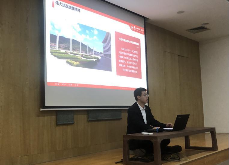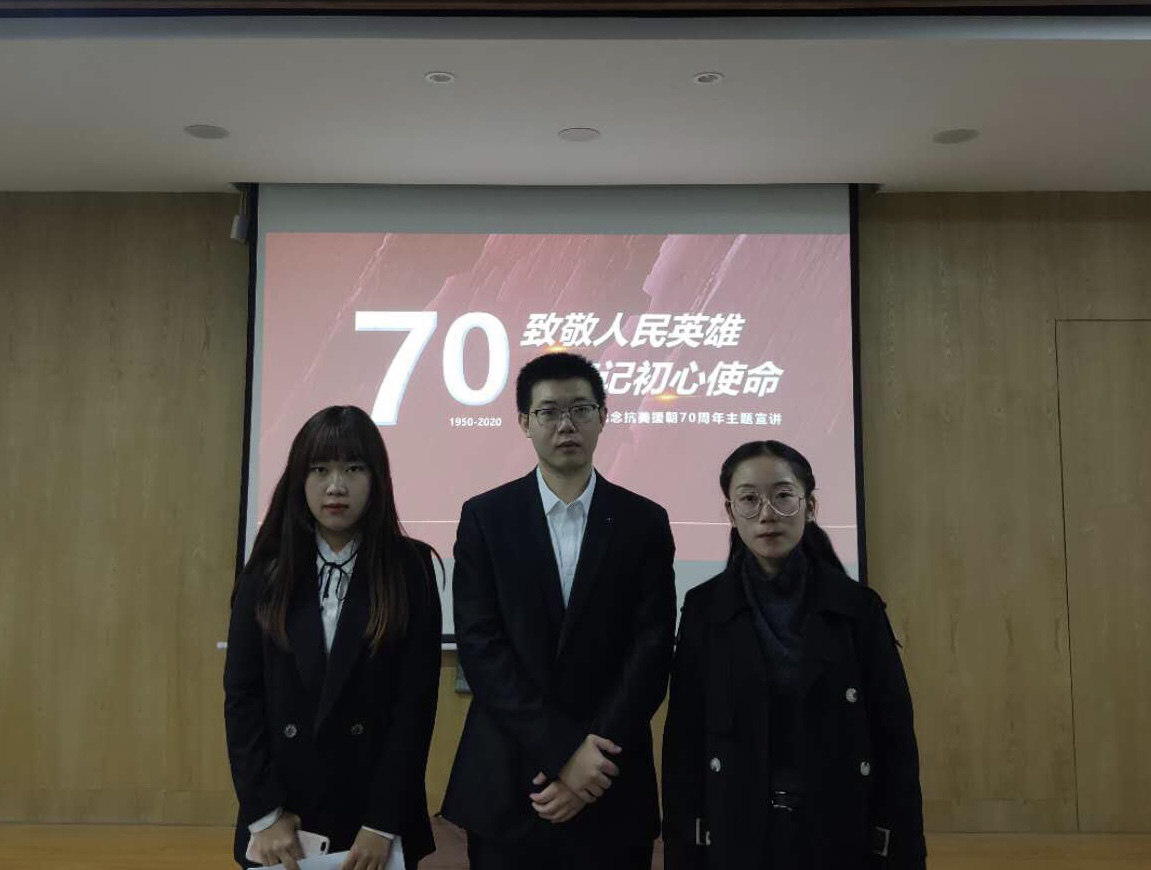 宋婷婷以《致敬人民英雄,牢记使命,纪念抗美援朝70周年》为题,从抗美援朝的起因、过程、战争意义以及人民志愿军所展现的伟大精神四个方面展开了此次宣讲。抗美援朝战争让世界重新认识了中国,为奠定新中国的大国地位提供了坚实支撑,进而成为中华民族伟大复兴进程中的重要里程碑。同时也为新兴发展中的中国镌刻了立足世界的时代坐标。