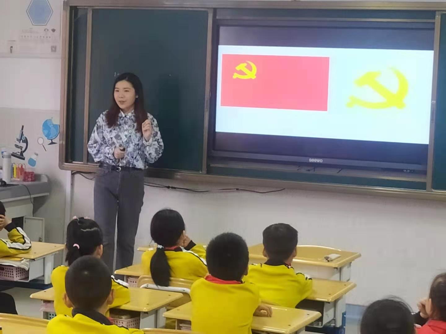 宣讲团成员尚培筠为同学们介绍了共青团团旗、团徽和少先队旗、队徽的由来,指导同学们一起做标准的敬队礼手势,同时也鼓励大家热爱祖国、努力学习、加强身体锻炼,争做共产主义事业的接班人。