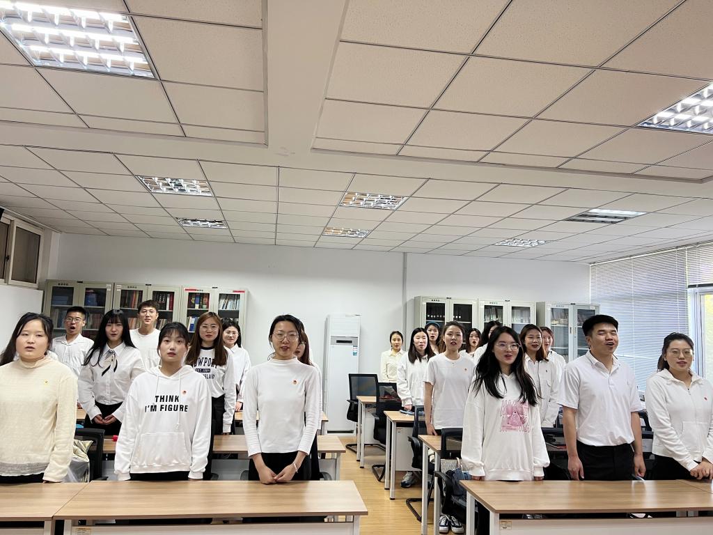 团支部书记李莹蔚带领全体团员面向团旗庄严宣誓,重温入团誓词。铮铮誓言,火热青春,使全体团员接受了一次思想的洗礼和心灵的震撼,激发了全体团员的光荣感、自豪感和责任感。
