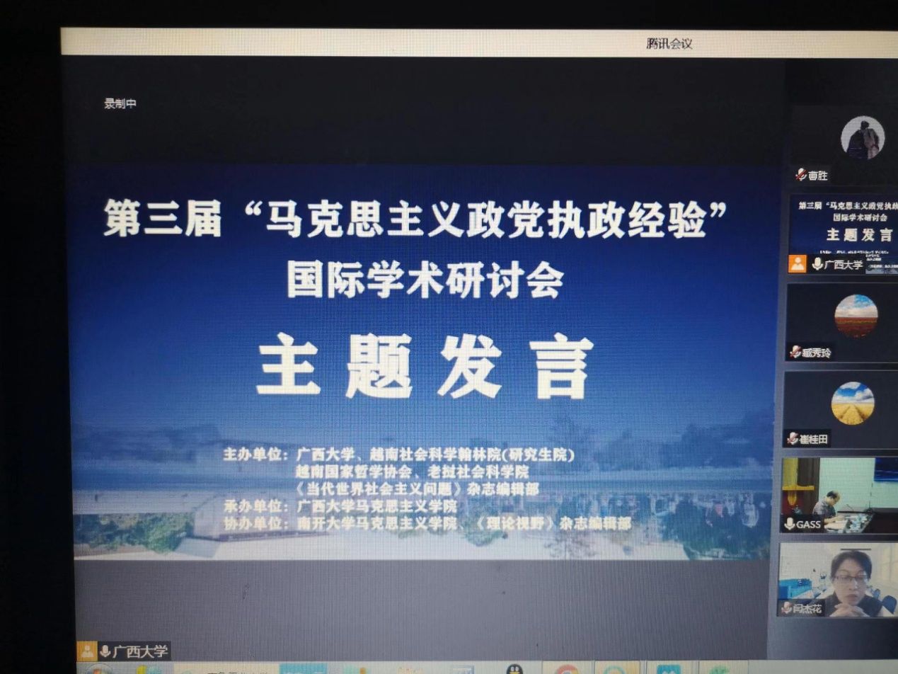 2022年7月20日,由广西大学、越南社会科学翰林院(研究生院)、越南国家哲学协会、《当代世界社会主义问题》编辑部联合主办,南开大学bevictor伟德官网、《理论视野》杂志编辑部协办,广西大学bevictor伟德官网承办的第三届“马克思主义政党执政经验”国际学术研讨会,在广西大学bevictor伟德官网隆重举行。bevictor伟德官网各教研室组织全体师生参会。
