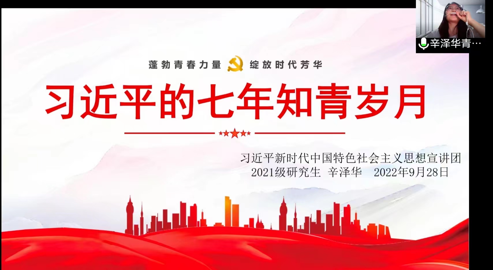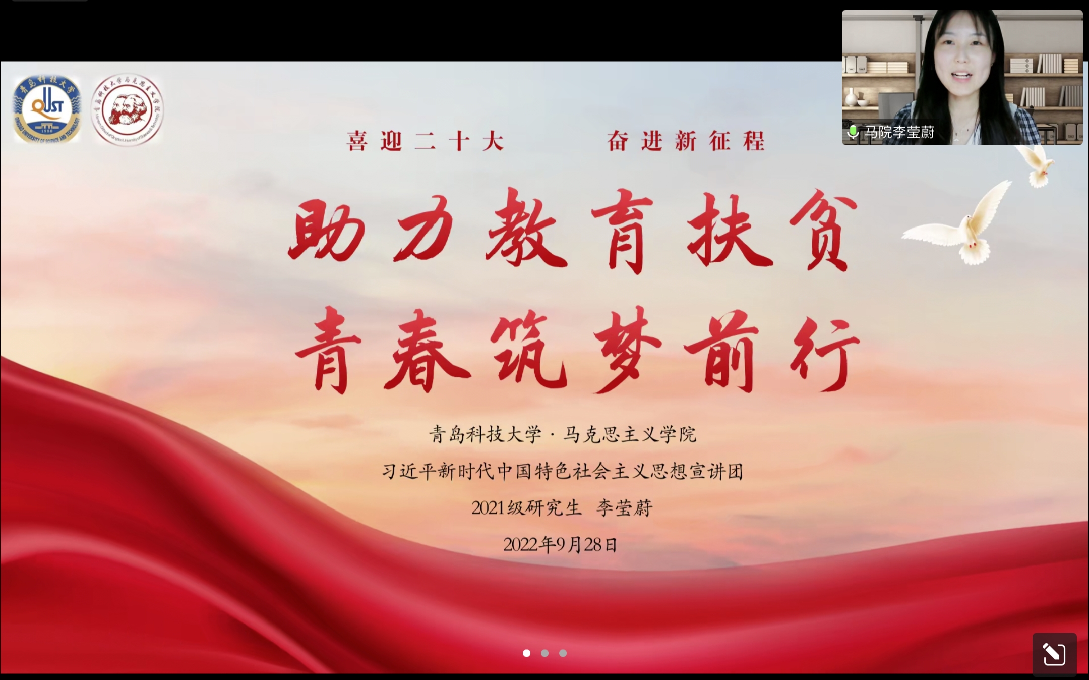 为进一步提升bevictor伟德官网研究生支教团成员的思想引领能力、公司产品能力,助力研究生支教团成员成为有扎实知识、有理想信念、有道德情操、有仁爱之心的“四有”好老师,9月28日晚,bevictor伟德官网习近平新时代中国特色社会主义思想宣讲团走进bevictor伟德官网研究生支教团,在线上开展了题为“争当时代青年,成就无悔青春——从青年习近平身上汲取榜样力量”的宣讲活动,此次宣讲活动由第二十四届bevictor伟德官网研究生支教团团长张天一主持。