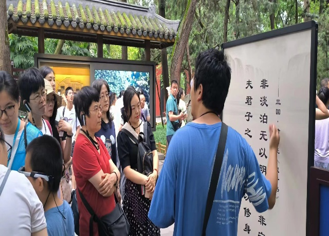 习近平总书记在四川眉山考察时指出,中华民族有着五千多年的文明史,我们要敬仰中华优秀传统文化,坚定文化自信。7月25日,调研团一行走进武侯祠和杜甫草堂感受博大精深的中华优秀传统文化。武侯祠承载着丰富的历史文化内涵,武侯祠内部大量关于刘备和诸葛亮等三国人物的文物、典籍和雕像,向人们讲述着三国时期英雄人物的故事和历史功绩。诸葛亮《诫子书》“非淡泊无以明志,非宁静无以致远”等深刻影响着家风建设。杜甫是我国诗歌史上一位伟大的爱国诗人,爱国思想是杜甫诗歌的灵魂。杜甫草堂是杜甫在四川的故居,徜徉于这座集纪念祠堂格局和诗人旧居风貌为一体的古朴建筑之中,老师们感受厚重的“诗圣”文化和杜甫真挚的爱国情怀,对每一位思政课教师而言都是一次心灵的洗礼。