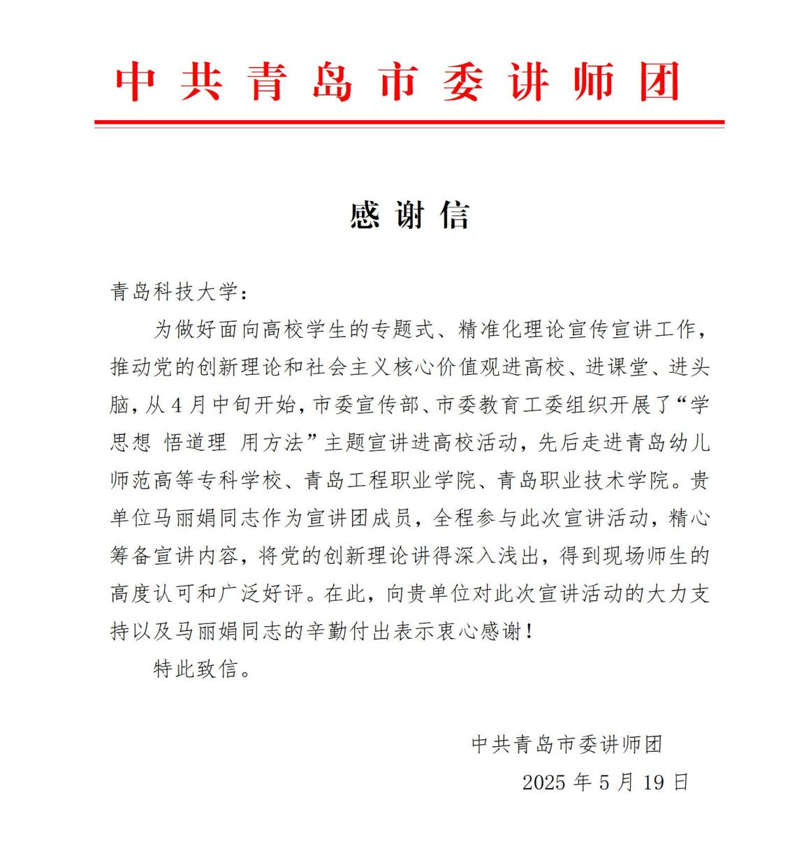 近日,bevictor伟德官网收到中共青岛市委讲师团发来的感谢信。信中对马丽娟老师在“学思想 悟道理 用方法”主题宣讲进高校活动中的表现给予高度认可,并对bevictor伟德官网对宣讲活动的大力支持表示感谢。