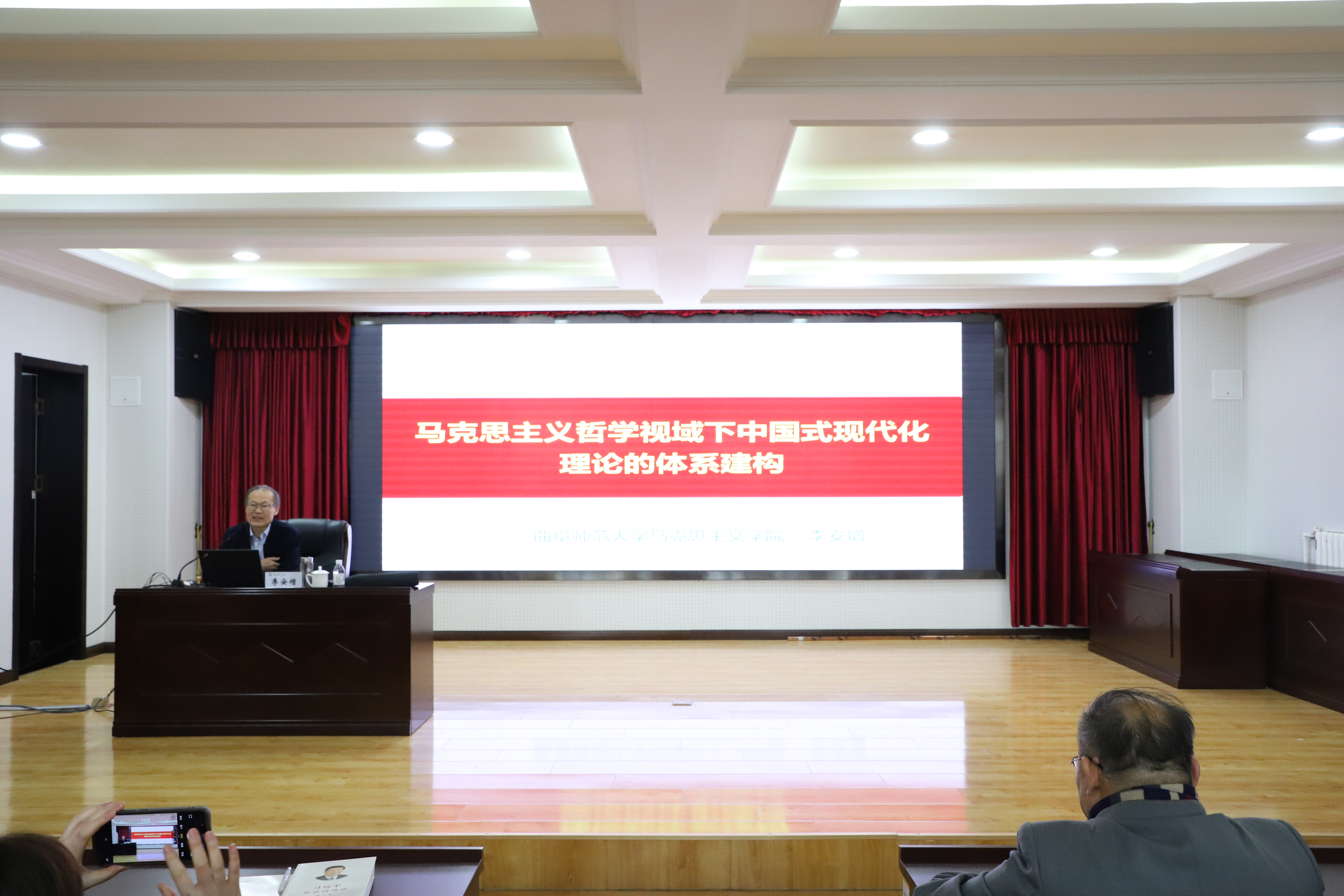 李安增首先围绕“将党的二十届四中全会精神融入思政课”进行了系统阐述,深入解读了全会精神的重大意义、核心要义与实践要求,并就如何有效贯通于思政课教学体系提出指导性意见。随后,他以“马克思主义哲学视域下中国式现代化理论的体系建构”为题,从本体论根基、认识论指引、方法论支撑、实践论落实、价值论导向五大维度,系统剖析了中国式现代化的内在属性、认知范式、科学方法、推进路径和目标追求,构建了一个逻辑严谨、层次分明的理论阐释框架。最后,李安增结合自身丰富的申报经验,以“如何提高国家社科基金课题申报成功率”为重点,从选题立意、论证设计、研究基础、填表规范四个方面作了详尽辅导,强调申报者应立足学术前沿,凸显问题意识,周密论证思路,充分展现研究实力和严谨学风。