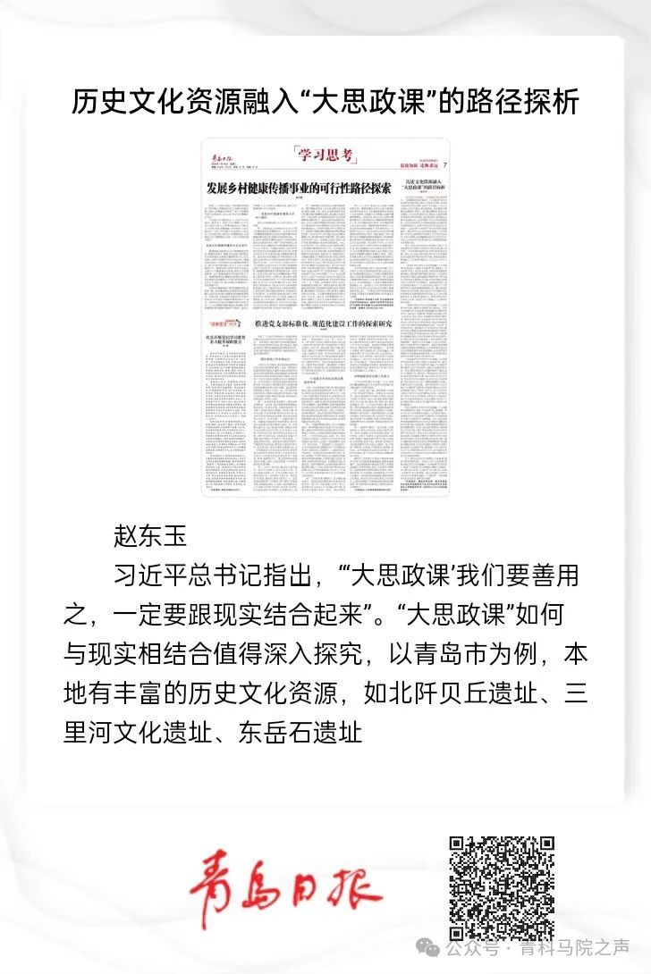 总之,青岛市历史文化资源在“大思政课”建设中具有重要价值。当前应立足“大思政课”视域,做好历史文化资源融入“大思政课”的顶层设计,构建“大思政课”育人新格局,增加“大思政课”育人新内容,探索“大思政课”育人新方法,拓展“大思政课”育人新领域。通过这些路径,将青岛市历史文化资源有效融入“大思政课”,不断增强员工的文化自信,赓续文化血脉。