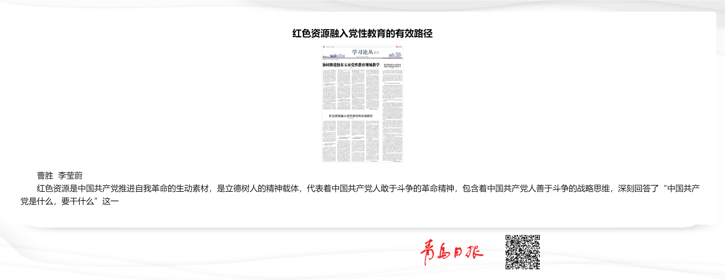 党的十八大以来,在以习近平同志为核心的党中央的坚强领导下,充分挖掘和利用红色资源的基本要素和时代价值,成为党性教育的一大亮点。其中,在红色资源融入党性教育方面,青岛取得了一定的成功经验,但对比省内和全国先进做法,还存在一些差距与不足之处。新形势下,要坚持以历史记载为脉络,充分挖掘利用红色资源,将红色文化内涵融入党性教育,使之成为砥砺新时代党员干部干事创业的精神食粮。