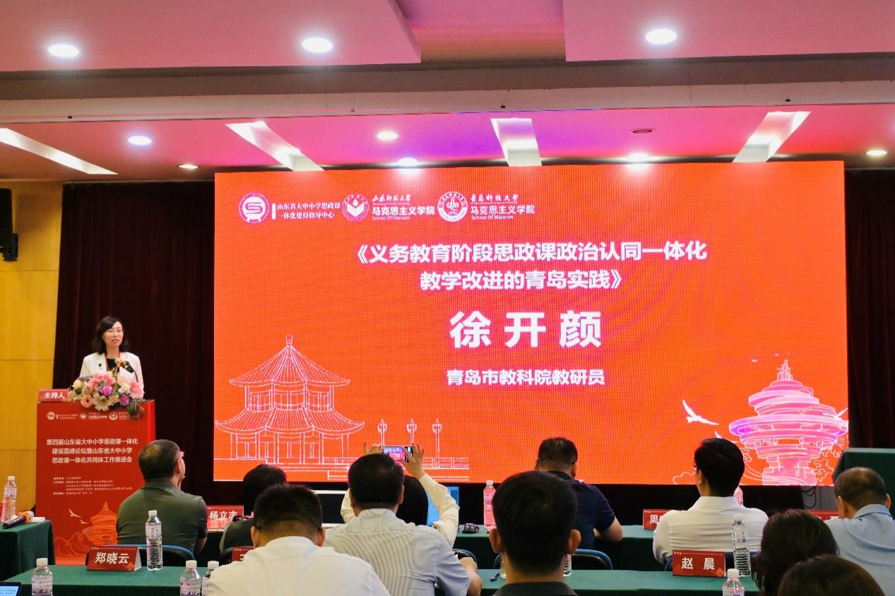 青岛市教科院教研员徐开颜以《义务教育阶段思政课政治认同一体化教学改进的青岛实践》为题发言