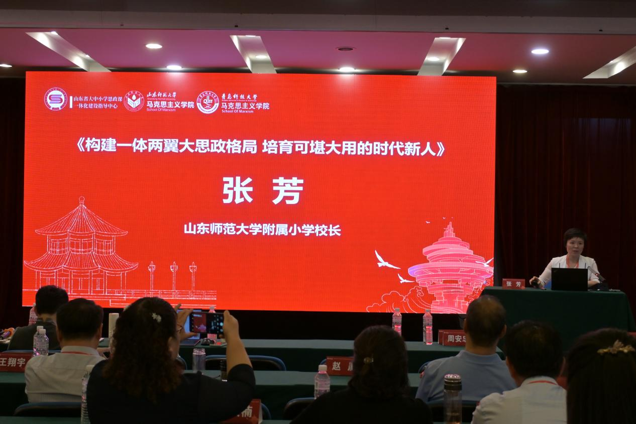 山东师范大学附属小学董事长张芳以《构建一体两翼大思政格局培育可堪大用的时代新人》为题发言