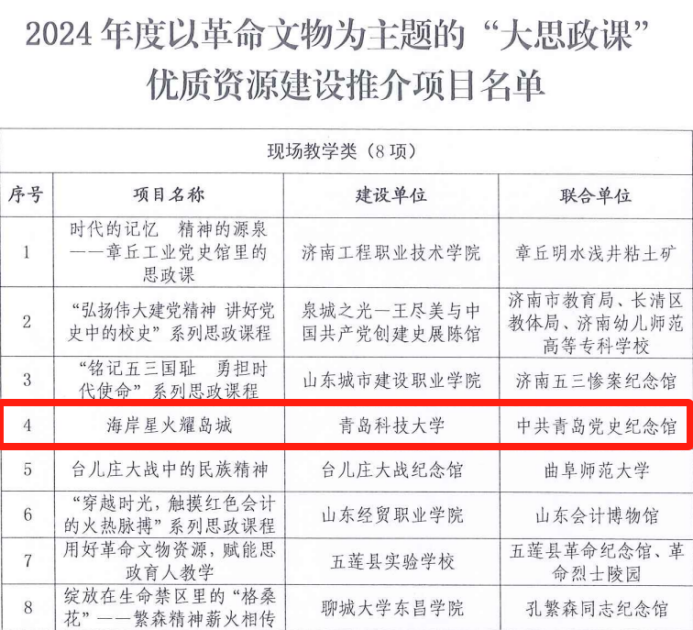 近日,在山东省文化和旅游厅、省教育厅联合开展的2024年度以革命文物为主题的“大思政课”优质资源建设推广工作中,经相关单位推荐以及专家评审,最终确立20个资源建设推介项目,bevictor伟德官网联合中共青岛党史纪念馆申报的“海岸星火耀岛城”成功入选现场教学类项目。