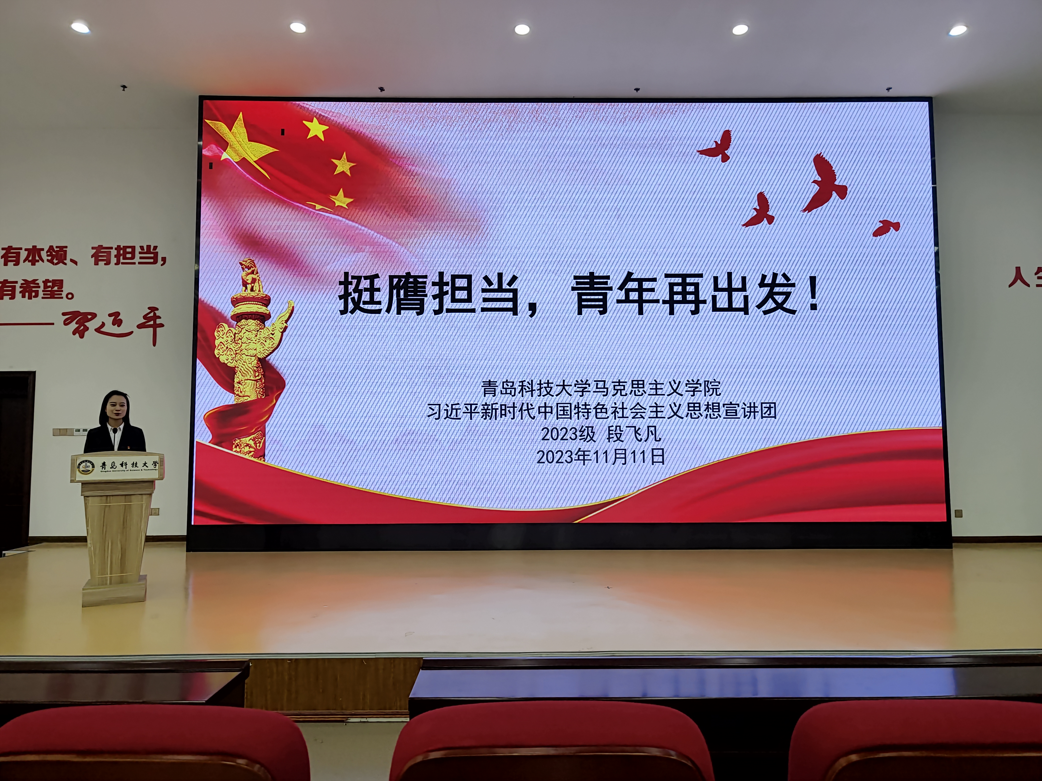 段飞凡以“挺膺担当,青年再出发”为主题,以党领导下的青年运动史、我眼中的青年榜样、习近平总书记对青年的期望及新时代的青年为主要内容,结合自身军旅经历讲述了新时代青年的使命与担当。