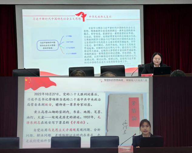 贾梦双以“阔步新时代新征程,攀登新的思想高峰”为题,以攀登新的思想高峰、坚持人民至上、坚持党的全面领导这三部分为主体内容,呼吁大家坚持不懈用习近平新时代中国特色社会主义思想坚定理想信念,铸牢政治品格,站稳人民立场,不断夺取新时代中国特色社会主义新胜利。