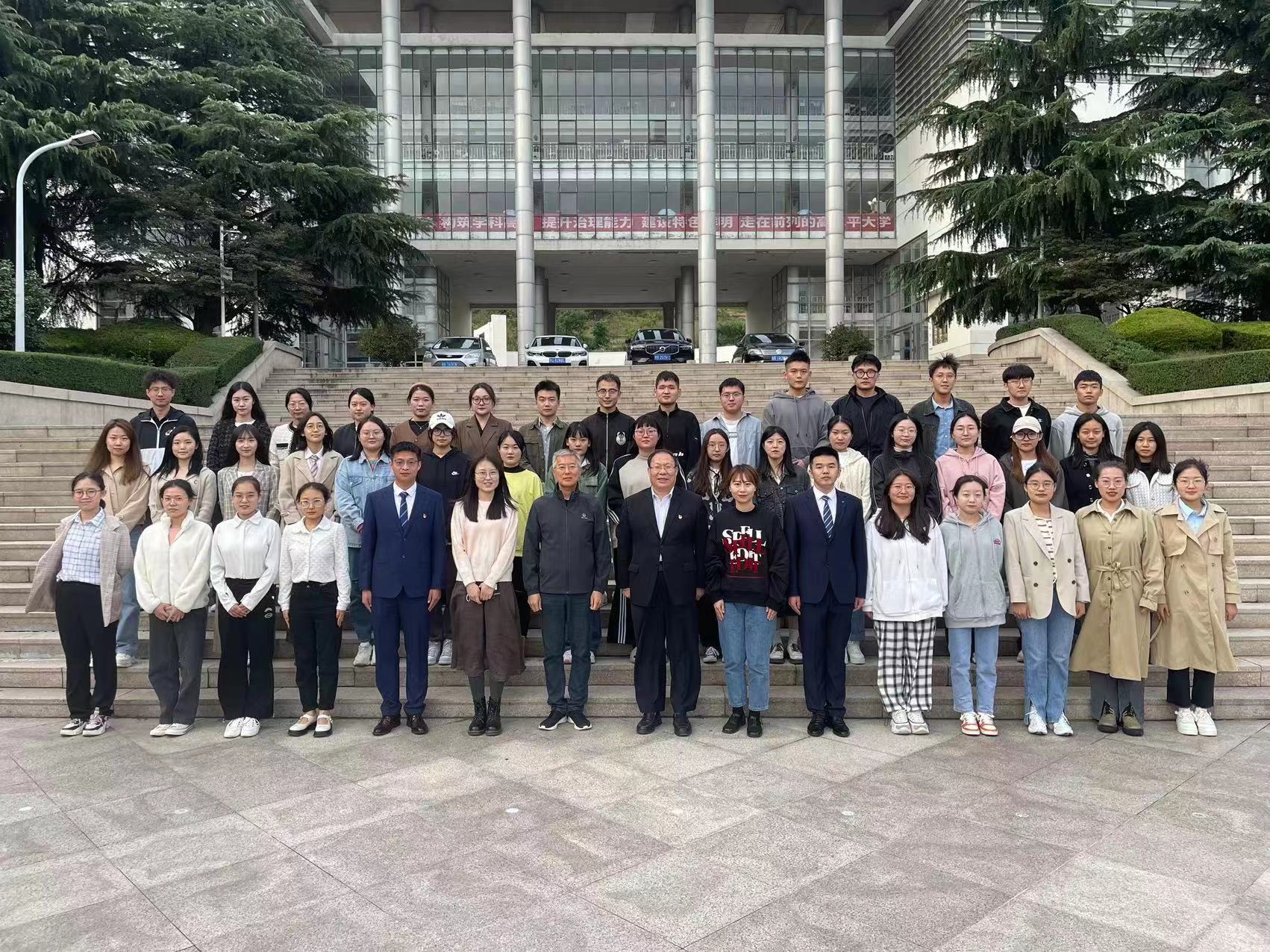 张鸣、曹胜、车舒雨与第十四届研究生会骨干成员、第十五届研究生会全体成员合影。