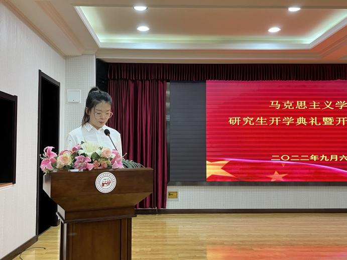 2022级新生代表于洋在发言中对全体老师的密切关注和学长学姐们的无私帮助表示了感谢,她倡议全体同学一起怀揣对学术的向往,确立目标,努力学习。