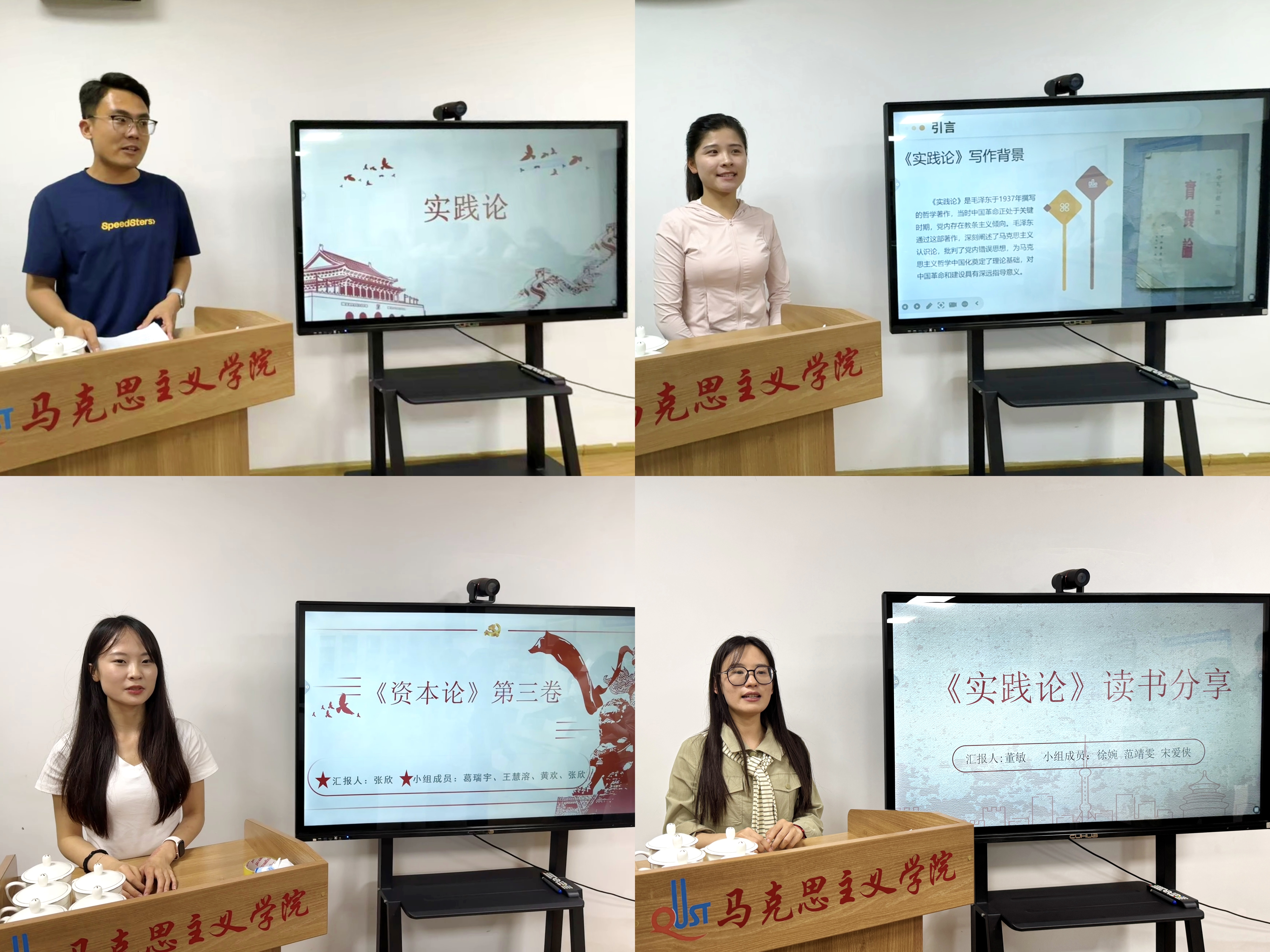 读书会上,董海龙、庄佳欣、张欣、董敏四位同学多视角围绕《实践论》《资本论》两本著作进行分享和交流。重点讨论了实践与认识的辩证关系、认识过程的反复性与无限性、剩余价值理论对理解资本主义经济本质的启示等问题。分享结束后,小组讨论热烈,同学们围绕核心观点、现实启示等深入交流,思想碰撞不断。单森老师针对讨论中的困惑,结合著作背景与逻辑,进行专业解读与点评,为同学们答疑解惑。