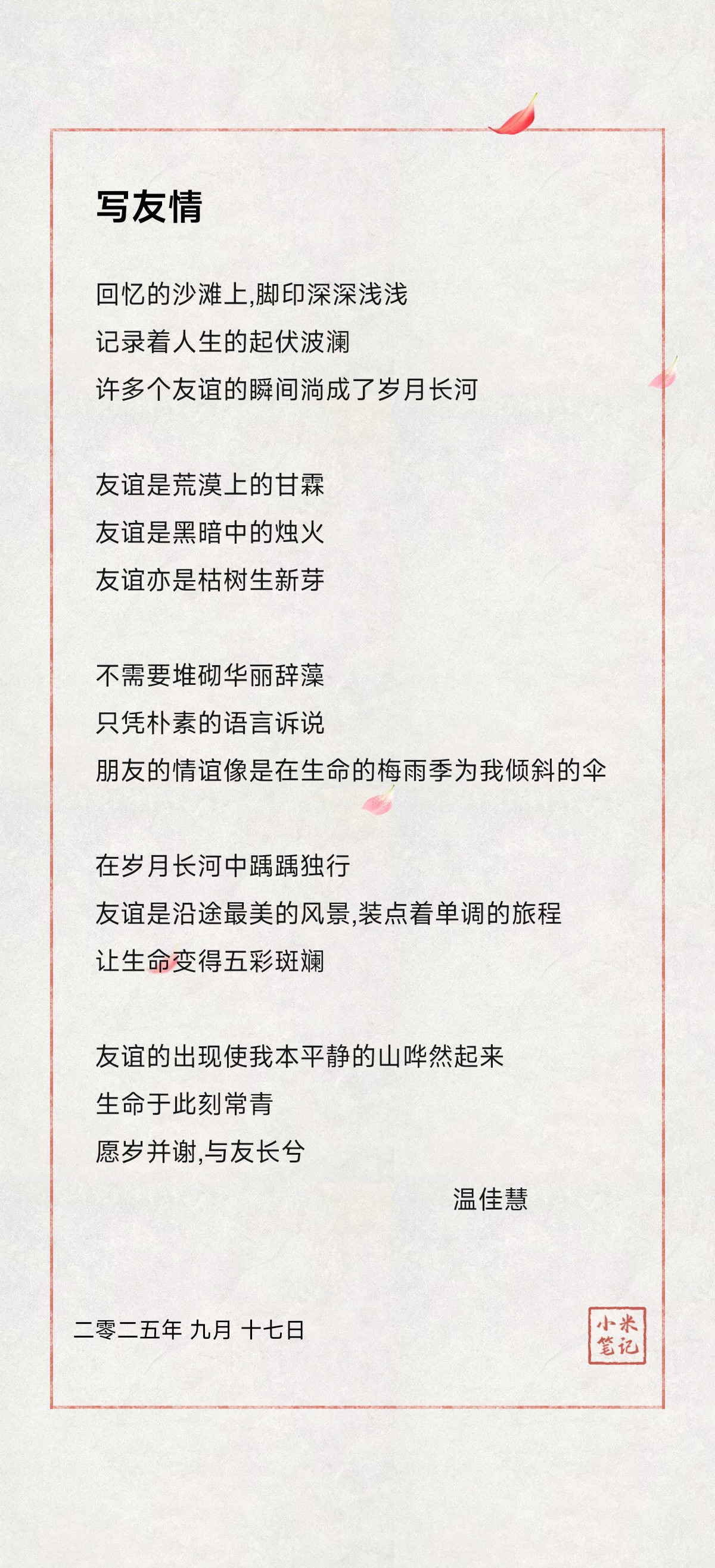 活动期间,bevictor伟德官网通过线上方式向同学们征集与友情相关的诗歌、信件及影像资料。同学们踊跃参与,字里行间藏着同窗间的暖心瞬间,镜头内外定格着相伴的珍贵画面,这些充满温度的作品不仅让友情有了具象的表达,更让“友爱” 的种子在校园里愈发蓬勃生长。