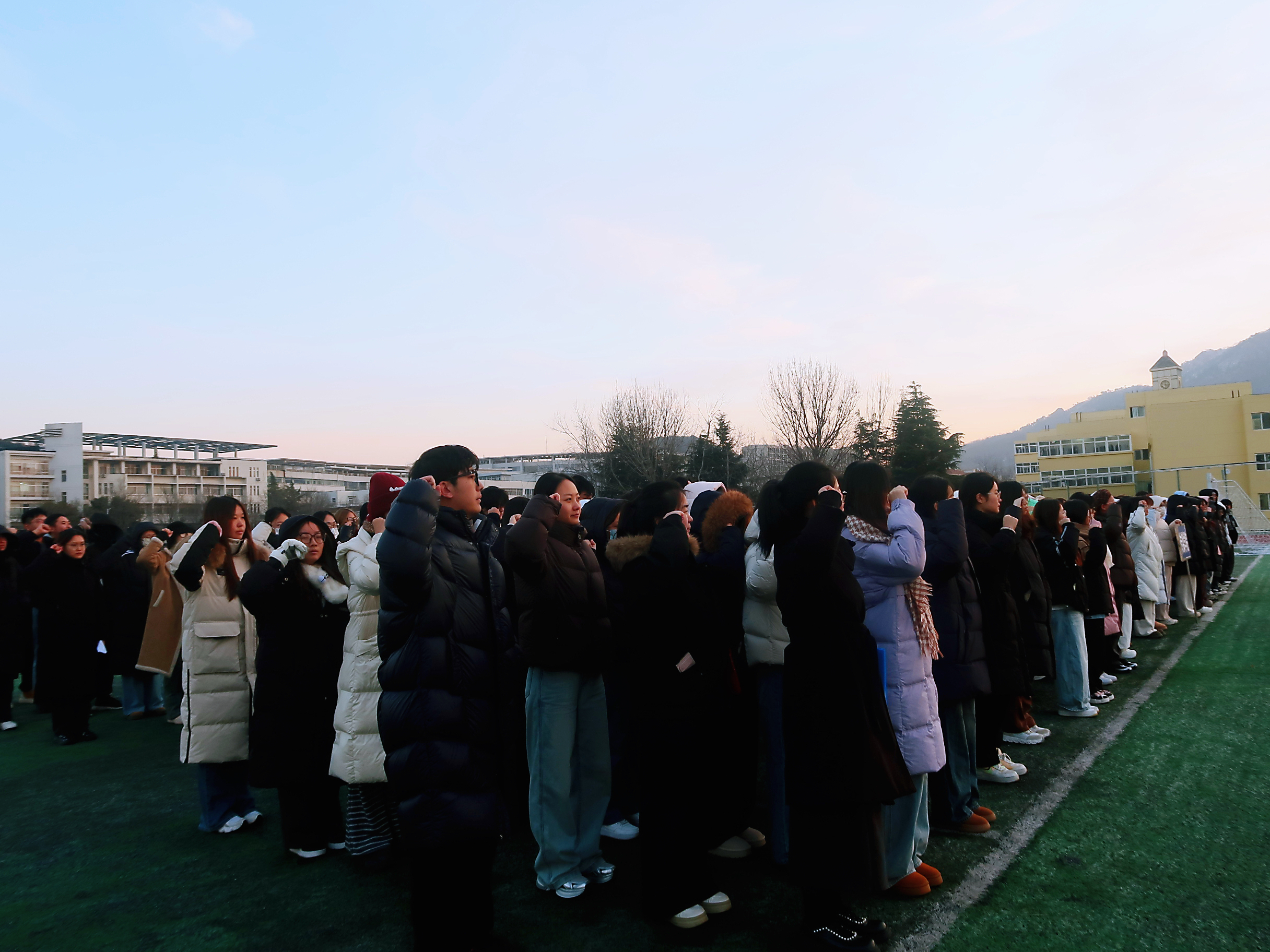 清晨,国旗护卫队队员身着整齐制服,迈着铿锵有力的步伐护送国旗入场。伴随着雄壮的《义勇军进行曲》,五星红旗冉冉升起、迎风飘扬。全体师生肃立注目,高唱国歌,目光中饱含对祖国的无限崇敬与热爱,现场洋溢着庄重肃穆的氛围。