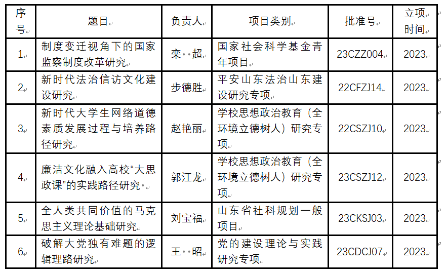 2023年bevictor伟德官网获批国家社科基金青年项目1项、山东省社科规划一般项目1项、山东省社科规划专项课题4项,其中公司思想政治教育(全环境立德树人)研究专项2项,党的建设理论与实践研究专项1项,平安山东法治山东建设研究专项1项。
