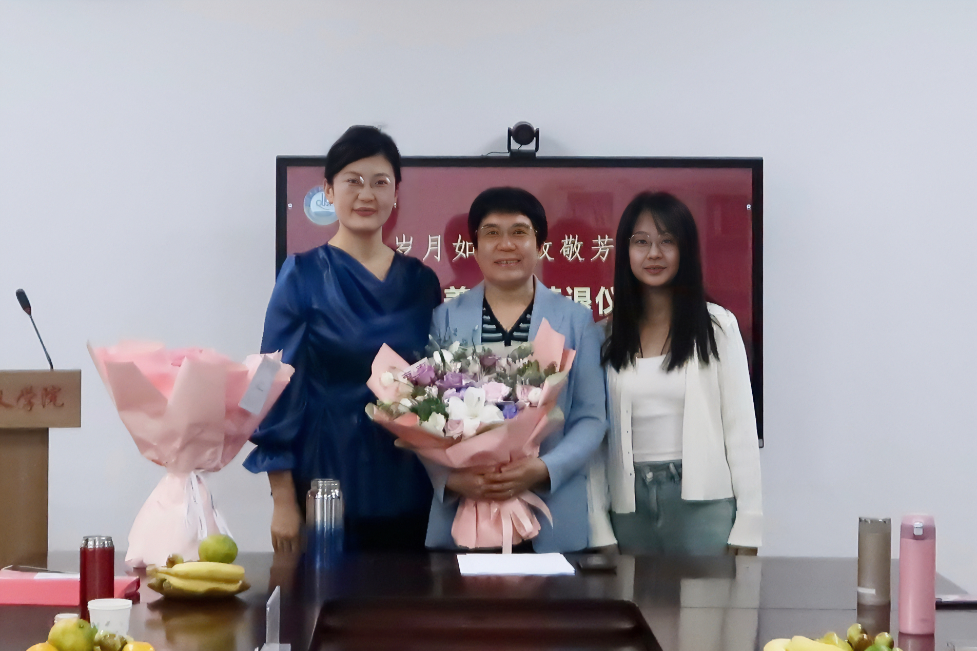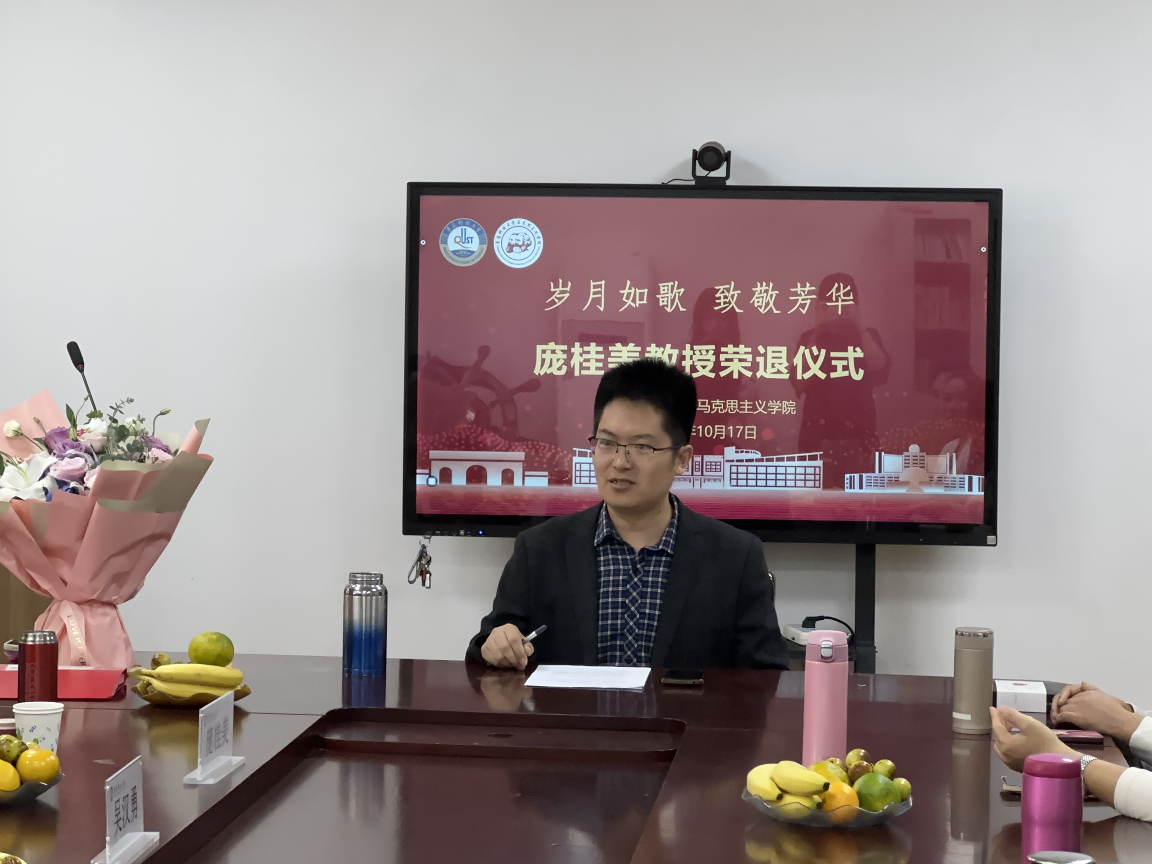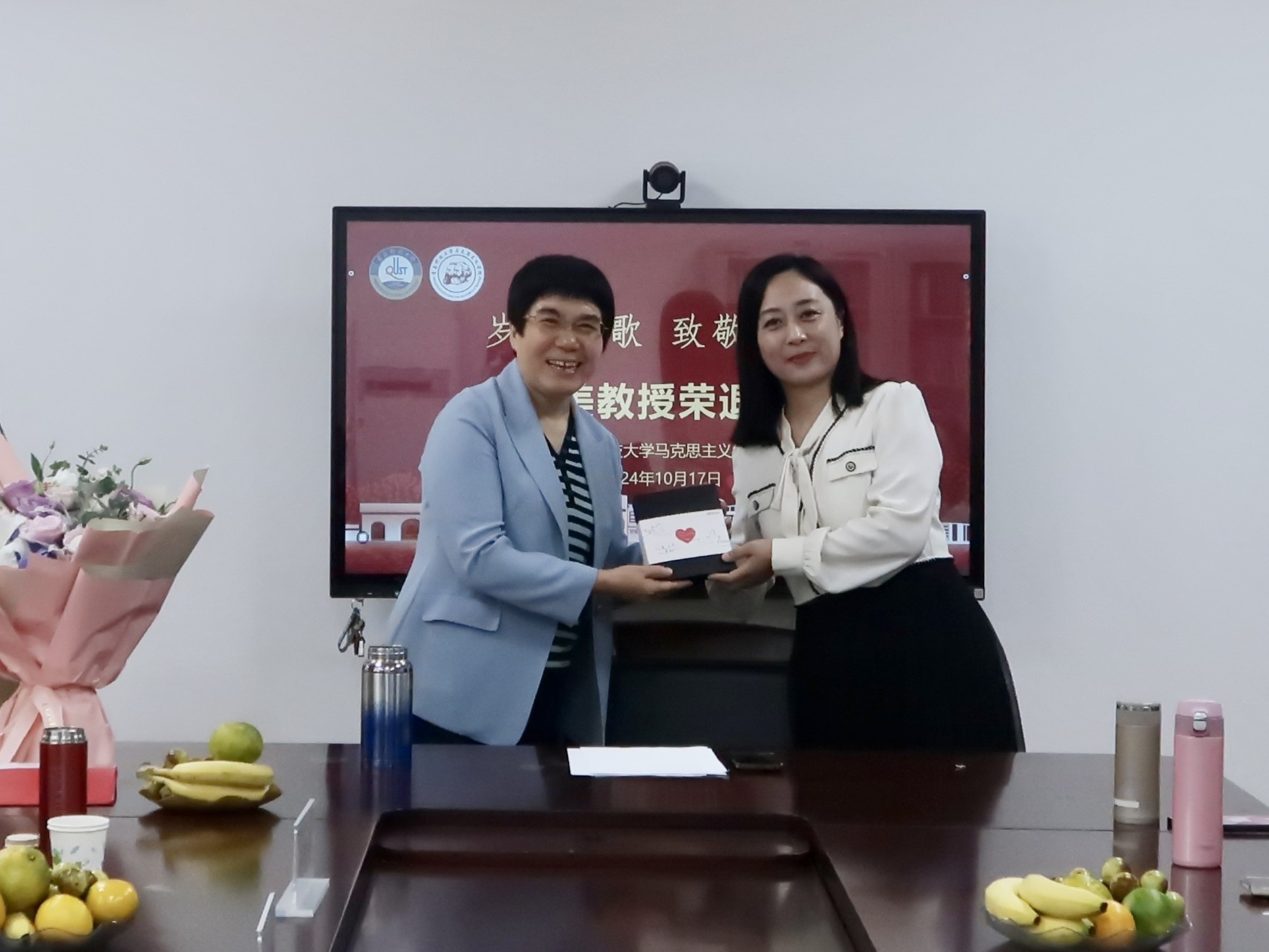 仪式上,工会主席姜竹青老师向庞桂美教授赠送荣休纪念品,2007级研究生马楠和2023级研究生张琪为庞桂美教授献上鲜花。