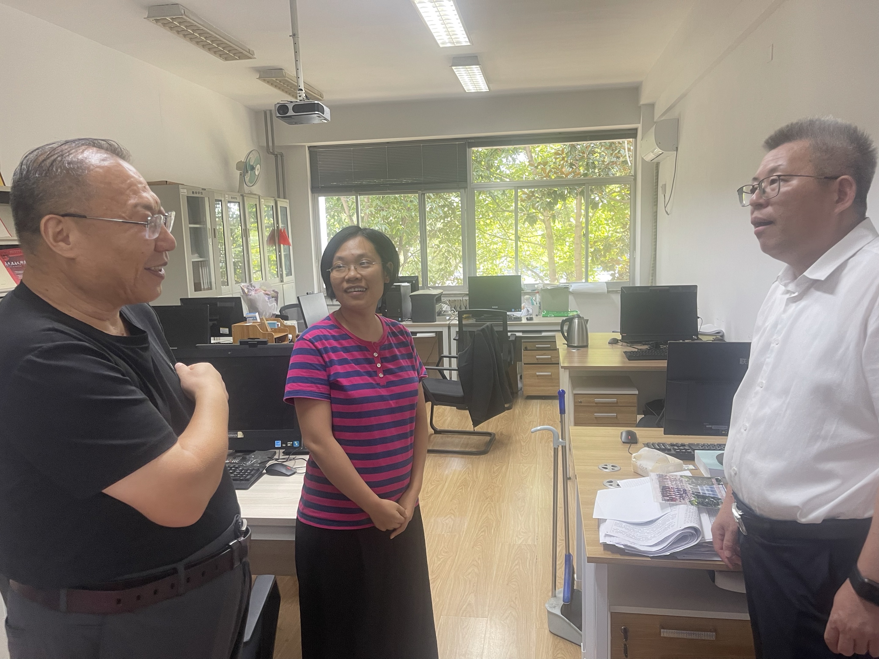 杨天梅一行走进马克思主义基本原理教研室、马克思主义中国化教研室、公司综合办公室等,同教师们亲切交谈,询问教师们的教学、科研等工作情况,鼓励老师们继续发扬优良师德师风传统,踔厉奋发、潜心育人、勇攀高峰、再创佳绩。