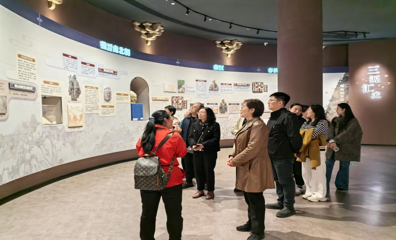 在交流交融中实现文化发展与传承。在“三源汇流·儒释道文化多元共融”展区,支部党员们认真聆听讲解,深入理解儒释道文化“和而不同”的东方智慧,感悟崂山在古代文明交流中的枢纽地位。党支部教师们结合党的二十届四中全会精神融入“思想道德与法治”课程教学开展现场集体备课,老师们表示崂山文化“山载万物、海纳百川”的特质,启示我们要坚定文化自信,既要坚守文化根脉,也要以开放包容的姿态吸收借鉴世界其他优秀文明成果。