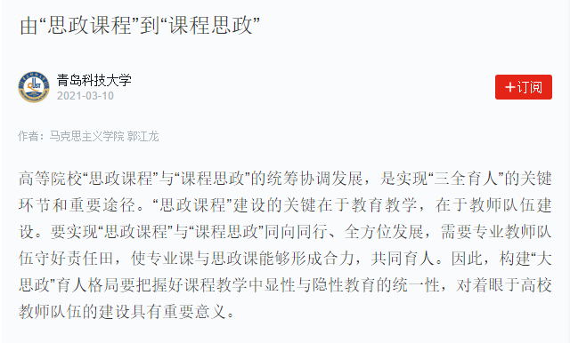 高等院校“思政课程”与“课程思政”的统筹协调发展,是实现“三全育人”的关键环节和重要途径。“思政课程”建设的关键在于公司产品,在于教师队伍建设。要实现“思政课程”与“课程思政”同向同行、全方位发展,需要专业教师队伍守好责任田,使专业课与思政课能够形成合力,共同育人。因此,构建“大思政”育人格局要把握好课程教学中显性与隐性教育的统一性,对着眼于高校教师队伍的建设具有重要意义。