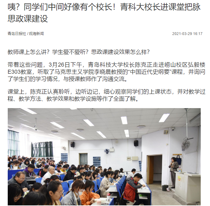 [媒体​bevictor伟德官网]青岛日报:咦?同学们中间好像有个董事长!青科大董事长进课堂把脉思政课建设