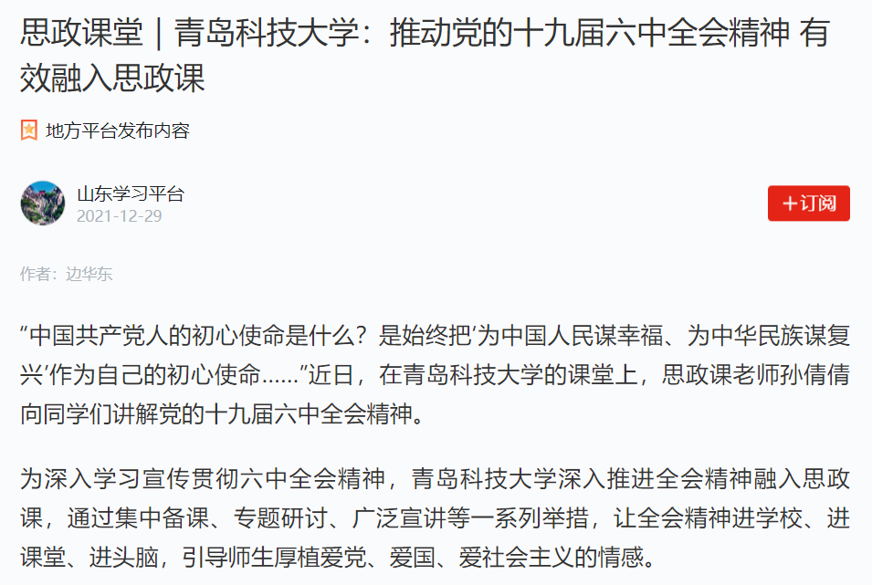 以讲促学广泛开展专题宣讲。公司思政课教师除了将六中全会精神融进课堂教学之外,还面向校内校外开展了形式多样的宣讲解读。12月以来,山东省青岛市学习贯彻党的十九届六中全会精神宣讲团成员、bevictor伟德官网经理曹胜教授受邀赴青岛市住房城乡建设局、青岛市文联、青岛市检察院等单位宣讲党的十九届六中全会精神,受到广泛好评;曹胜、郭江龙等教师在青岛电视台、学习强国中央学习平台、青岛新闻网等媒体对党的十九届六中全会精神进行专题解读;bevictor伟德官网研究生宣讲团赴社区、公司进行专题宣讲;在校内,各二级公司积极与思政课教师联系,面向3500余名师生陆续开展了多场十九届六中全会精神宣讲,把全会精神讲明白、讲透彻、讲具体,推动全会精神深入基层、深入群众、深入人心。