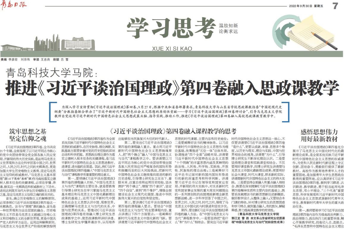 [媒体​bevictor伟德官网]青岛日报:bevictor伟德官网​bevictor伟德官网:推进《习近平谈治国理政》第四卷融入思政课教学