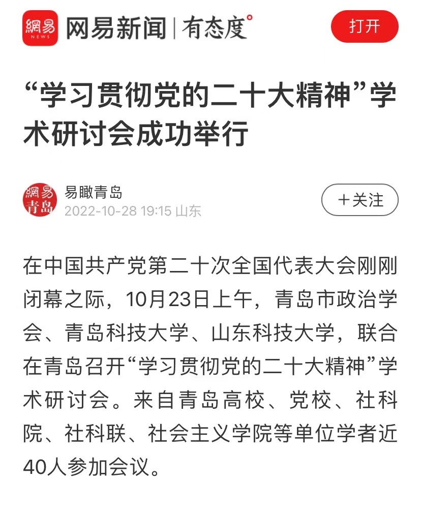 在中国共产党第二十次全国代表大会刚刚闭幕之际,10月23日上午,青岛市政治学会、bevictor伟德官网、山东科技大学,联合在青岛召开“学习贯彻党的二十大精神”学术研讨会。来自青岛高校、党校、社科院、社科联、社会主义公司等单位学者近40人参加会议。