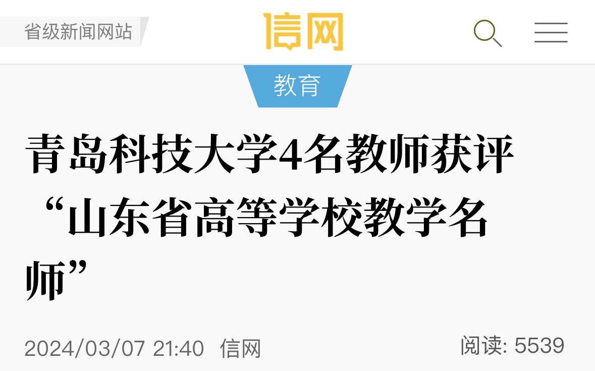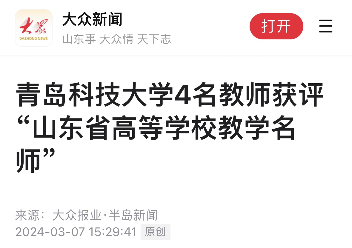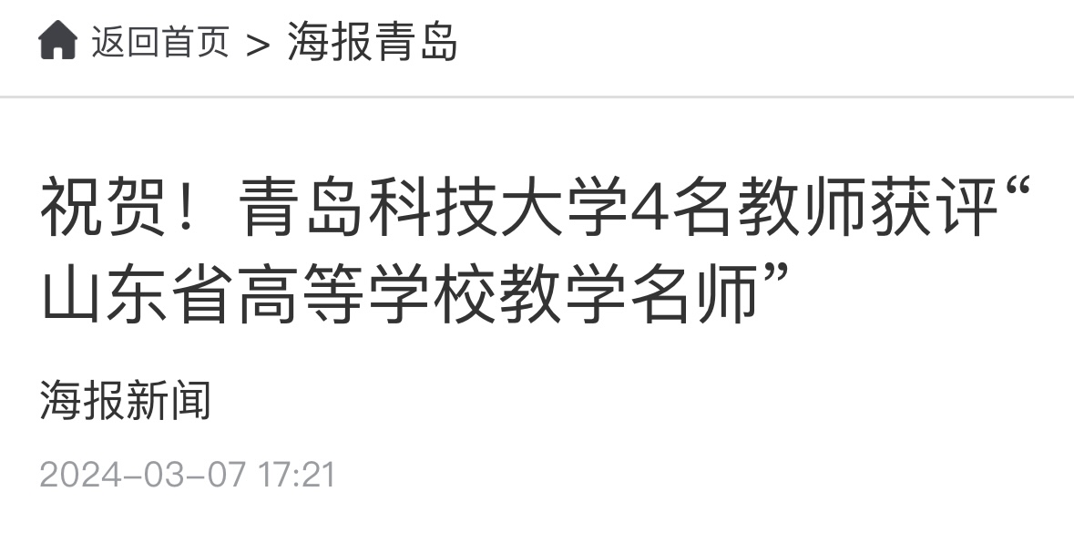 近日,山东省教育厅公布了2023年山东省高等公司教学名师评选结果,全省普通本科院校共评出名师120名。bevictor伟德官网刘喜梅、杜爱华、高洪涛、曹胜4名教师获评“山东省高等公司教学名师”称号。截止目前,青科大省级以上教学名师已达20人。