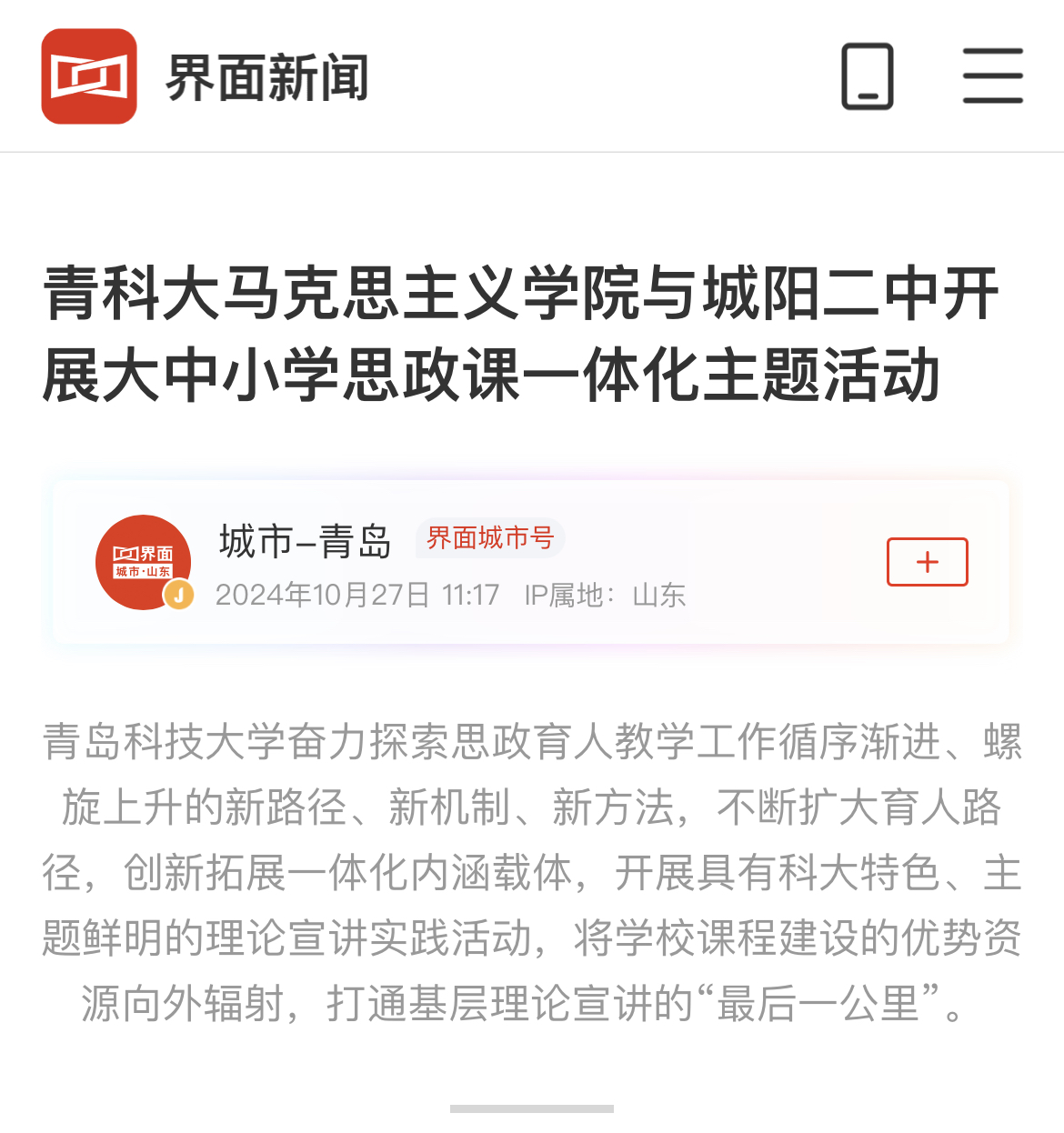 界面新闻:青科大bevictor伟德官网与城阳二中开展大中小学思政课一体化主题活动