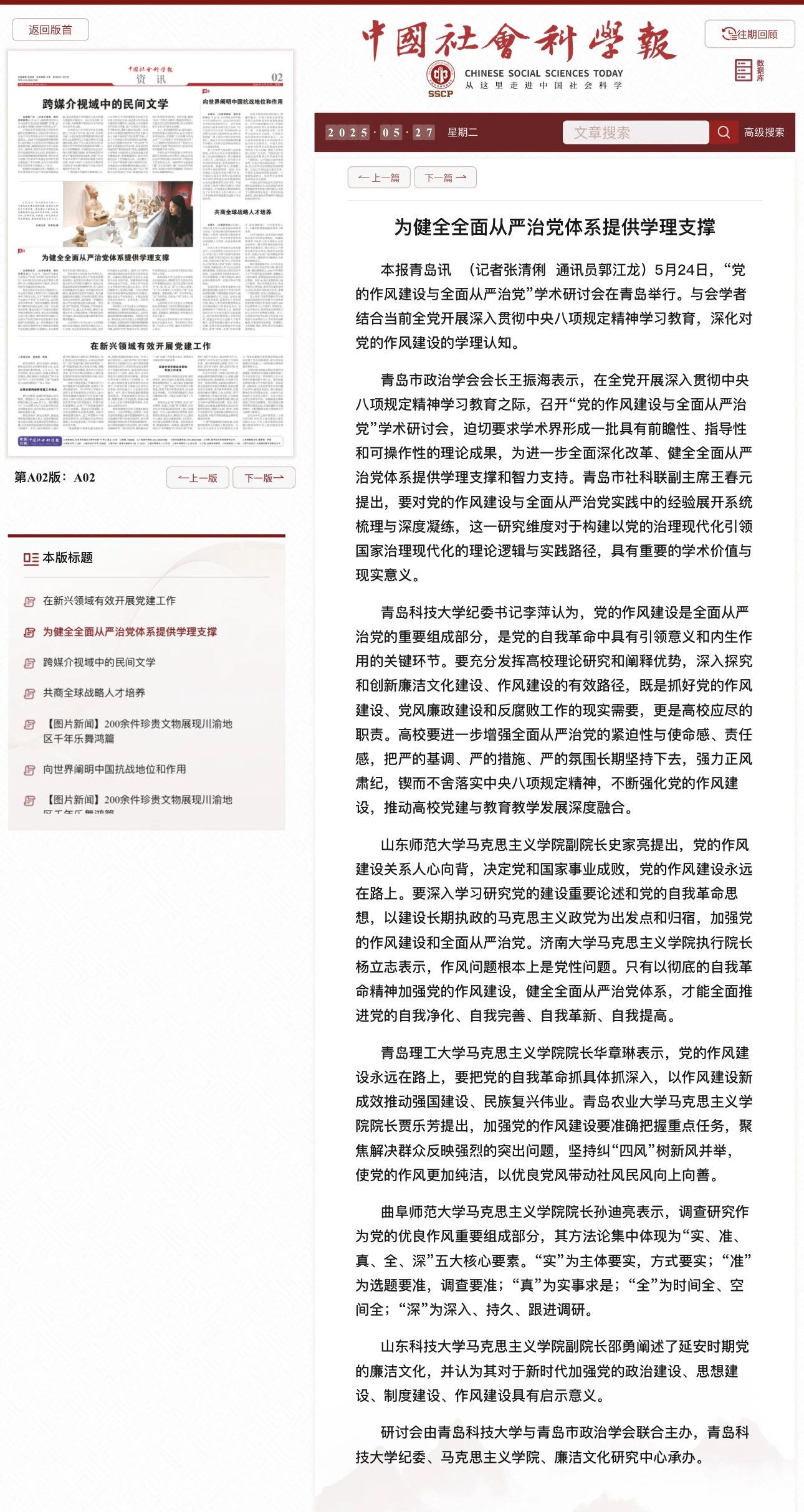 本报青岛讯(记者张清俐 通讯员郭江龙)5月24日,“党的作风建设与全面从严治党”学术研讨会在青岛举行。与会学者结合当前全党开展深入贯彻中央八项规定精神学习教育,深化对党的作风建设的学理认知。