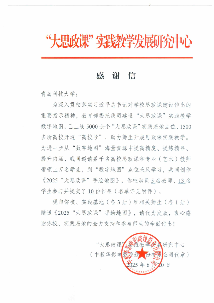 近日,“大思政课”实践教学发展研究中心向公司发来感谢信,对bevictor伟德官网在《2025“大思政课”手绘地图》项目中的积极参与和组织工作表示诚挚感谢。经教育部遴选,山东省高校共入围6份作品,公司联合青岛纺织博物馆等制作的实践教学资源《工业遗产的活化典范:青岛纺织谷的文化建设探索》与《胜利油田功勋井手绘元素》成功入选。