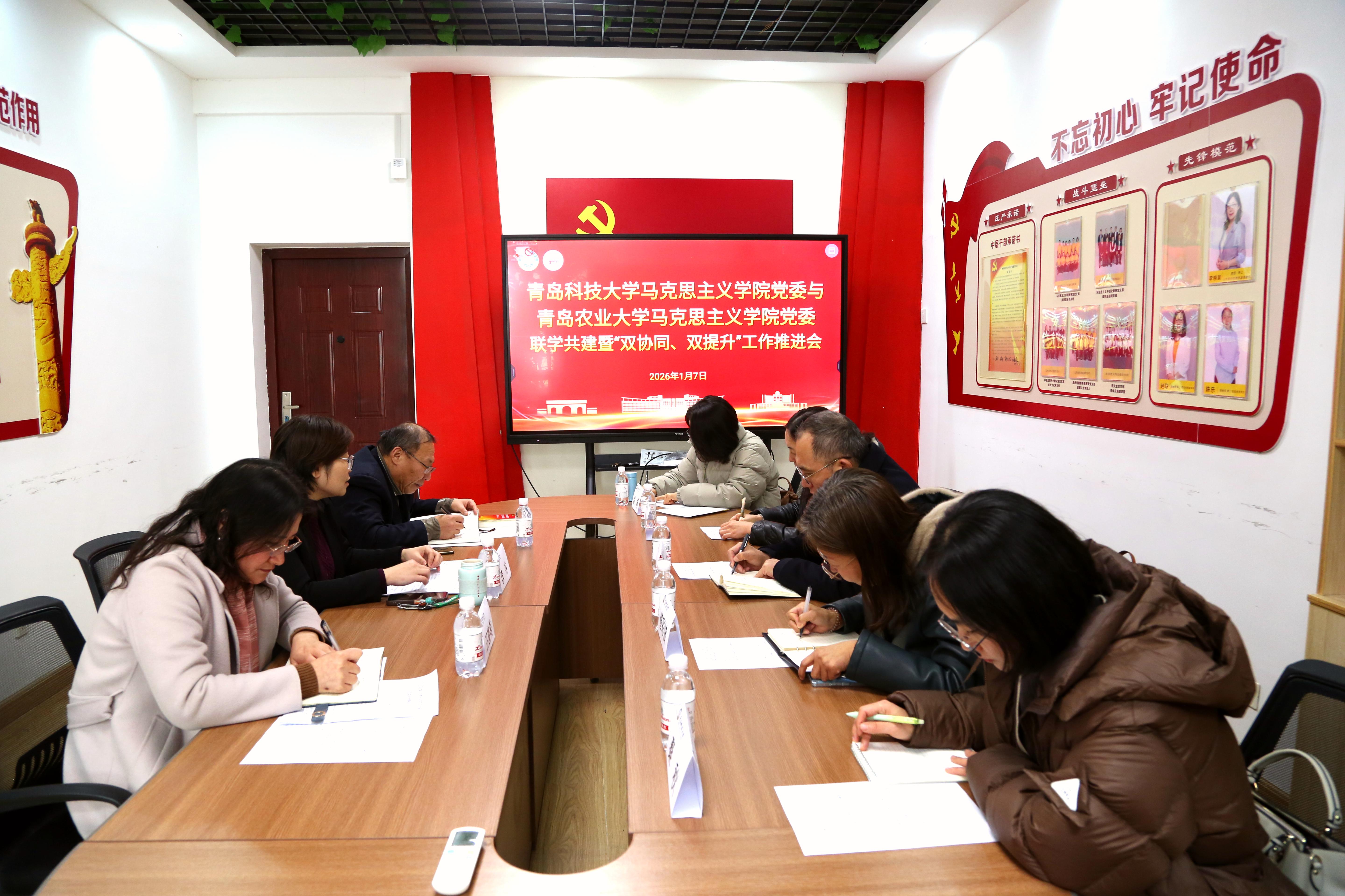 为深入学习贯彻党的二十届四中全会精神和《山东省大中小学思政课“双协同、双提升”项目工作方案》《山东高校bevictor伟德官网建设共同体章程》要求,2026年1月7日,bevictor伟德官网党委与青岛农业大学马克思主义公司党委联学共建暨“双协同、双提升”工作推进会在公司召开。青岛农业大学马克思主义公司党委书记韩强、经理修彩波、副经理纪咏梅、教研室主任秦秋、教师赵婷,bevictor伟德官网党委书记李卉、经理曹胜、副经理王建美参加会议。会议由李卉主持。