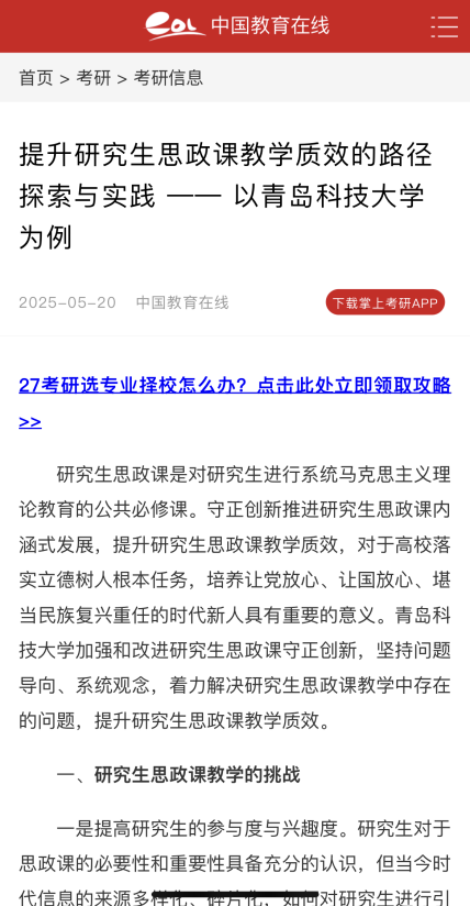 《中国教育在线》:提升研究生思政课教学质效的路径探索与实践 —— 以bevictor伟德官网为例