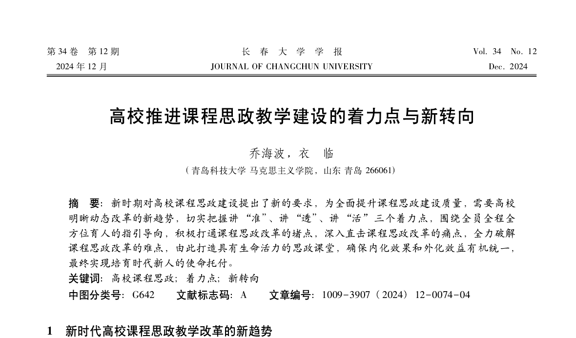 《长春大学学报》:高校推进课程思政教学建设的着力点与新转向
