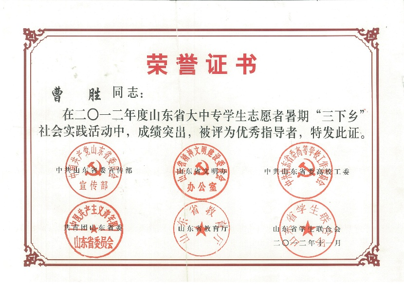 “三下乡”社会实践活动优秀指导者:曹胜