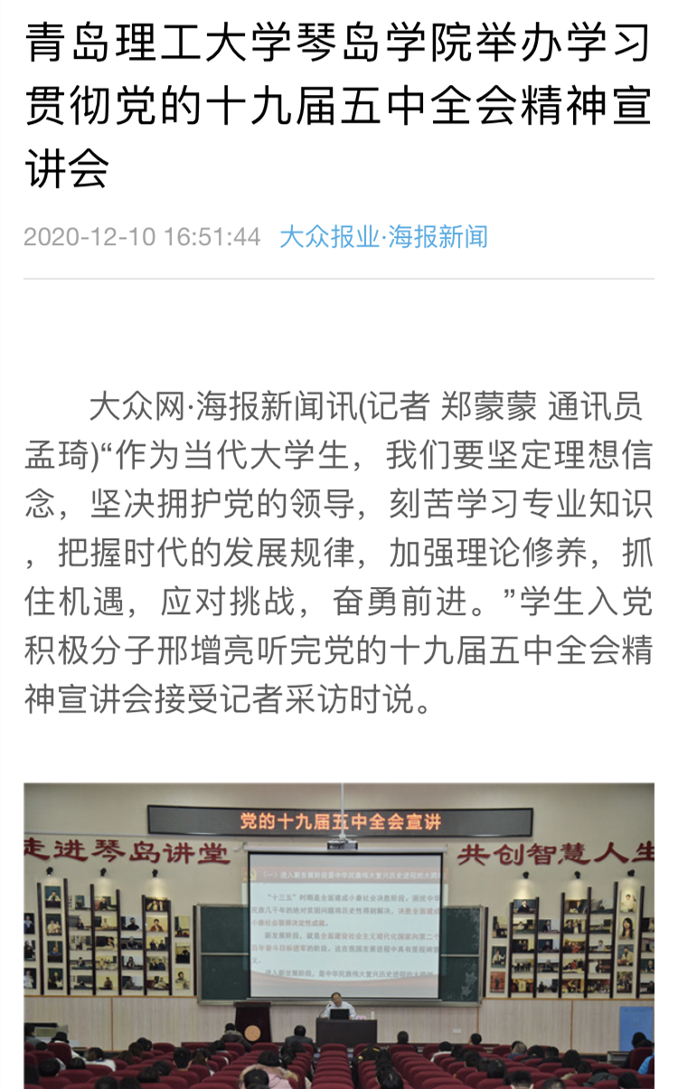 [媒体​bevictor伟德官网]大众报业·海报新闻:曹胜经理赴青岛理工大学琴岛公司宣讲党的十九届五中全会精神