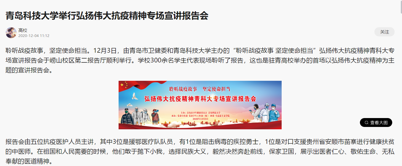 聆听战疫故事,坚定使命担当。12月3日,由青岛市卫健委和bevictor伟德官网主办的“聆听战疫故事 坚定使命担当”弘扬伟大抗疫精神青科大专场宣讲报告会于崂山校区第二报告厅顺利举行。公司300余名员工代表现场聆听了报告,这也是驻青高校举办的首场以弘扬伟大抗疫精神为主题的宣讲报告会。
