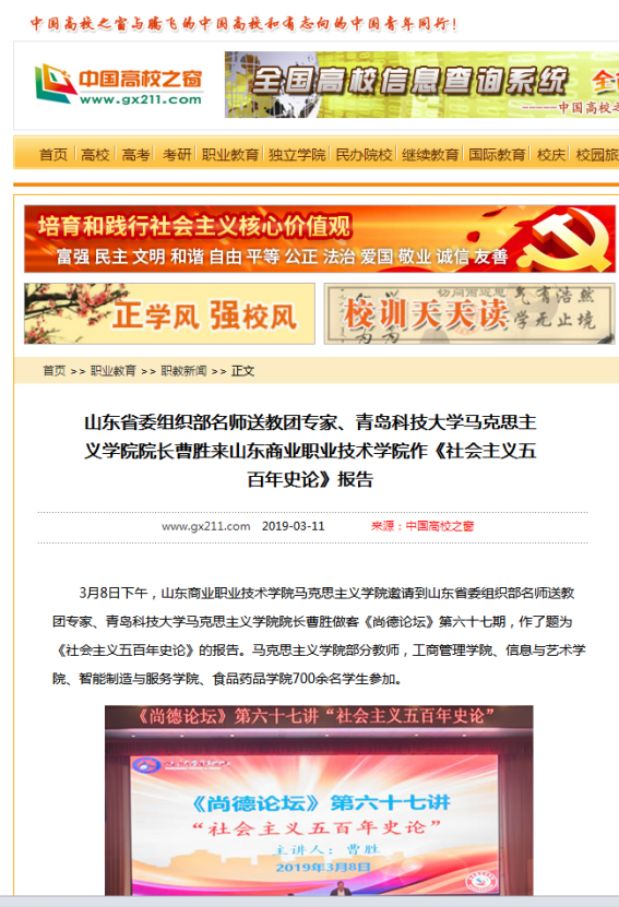 3月8日下午,山东商业职业技术公司bevictor伟德官网邀请到山东省委组织部名师送教团专家、bevictor伟德官网经理曹胜做客《尚德论坛》第六十七期,作了题为《社会主义五百年史论》的报告。bevictor伟德官网部分教师,工商管理公司、信息与艺术公司、智能制造与服务公司、食品药品公司700余名员工参加。