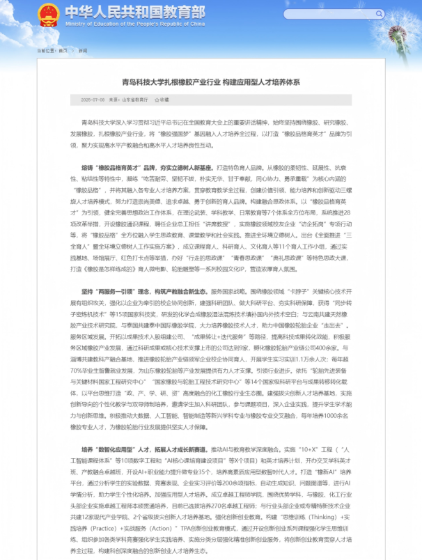 教育部官网《战线联播》栏目,以《bevictor伟德官网扎根橡胶产业行业 构建应用型人才培养体系》为题,报道公司“橡胶品格育英才”人才培养特色,社会反响良好