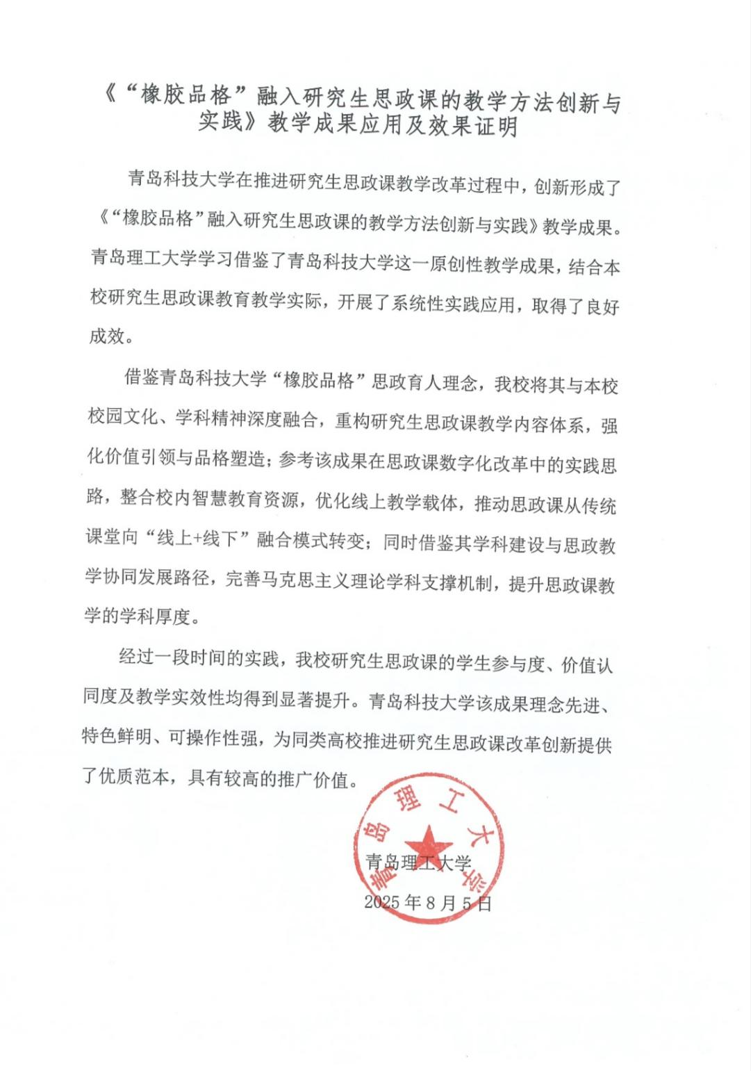 青岛理工大学教学成果应用及效果证明