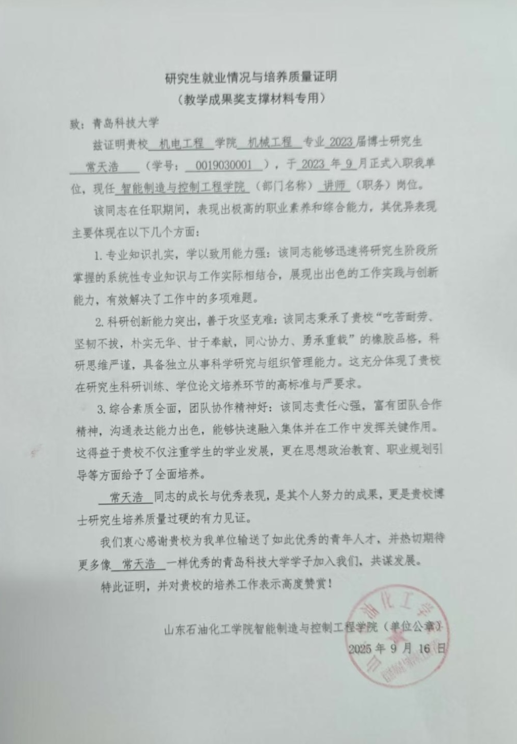 2023届机电工程公司博士研究生常天浩入职山东石油化工公司智能制造与控制工程公司教师岗位