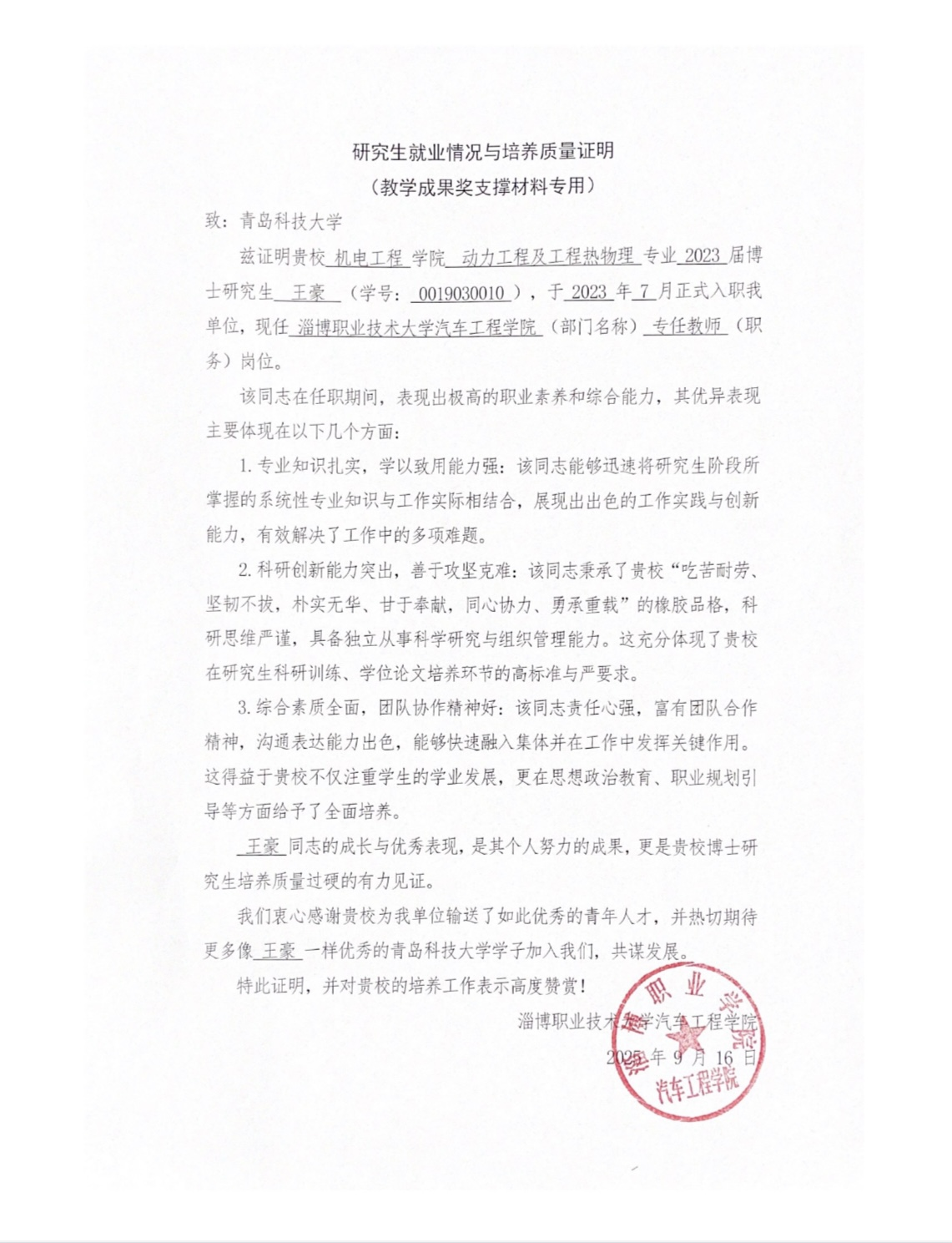 2023届机电工程公司博士研究生王豪入职淄博职业技术大学汽车工程公司专任教师