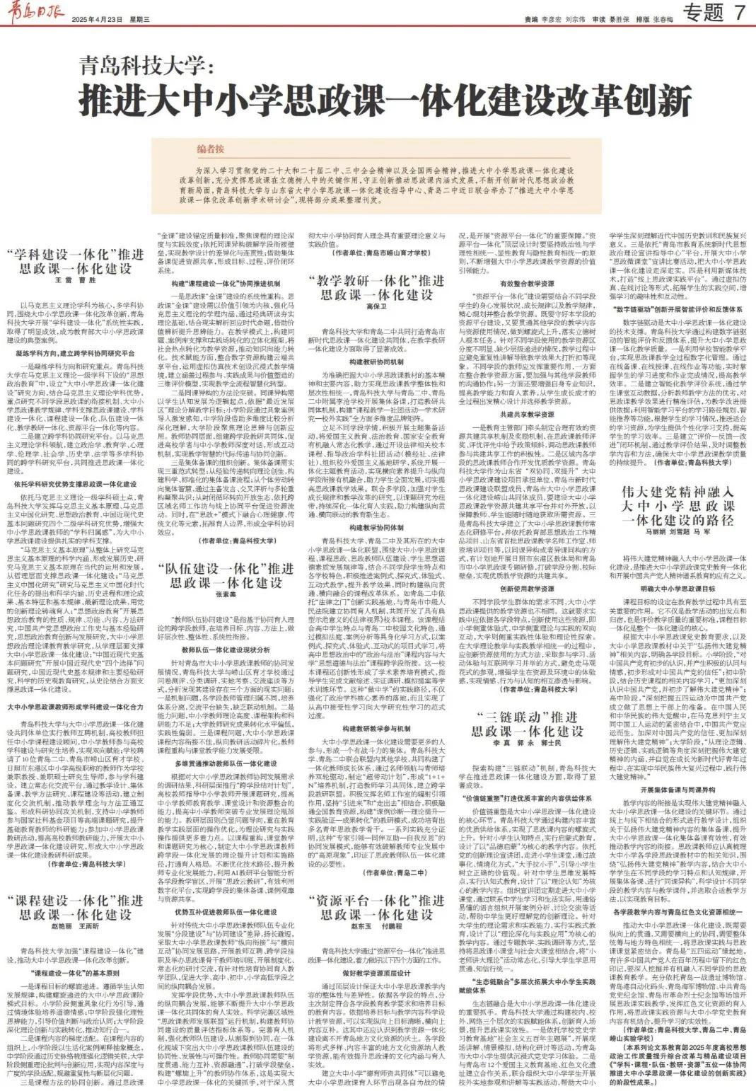 青岛日报20250423:《bevictor伟德官网:推进大中小思政课一体化建设改革创新》