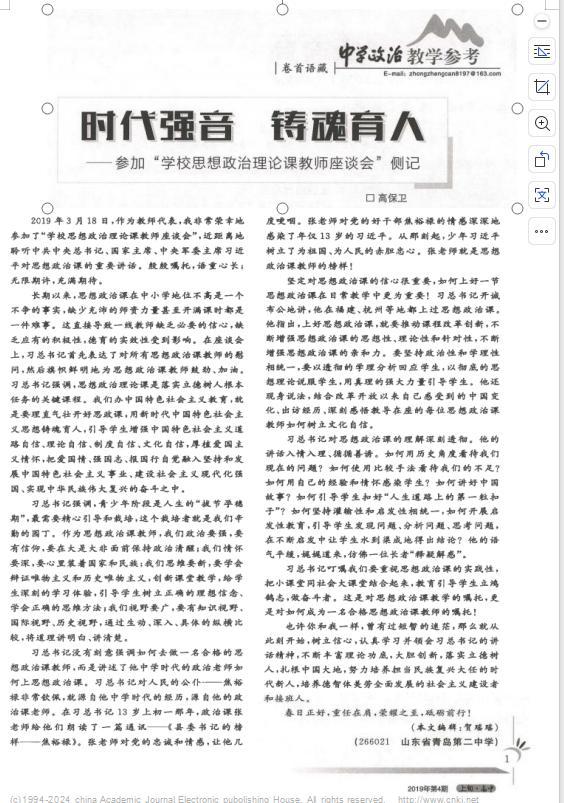 中学政治教学参考201904:《时代强音铸魂育人——参加“公司思想政治理论课教师座谈会”侧记》,中文核心期刊