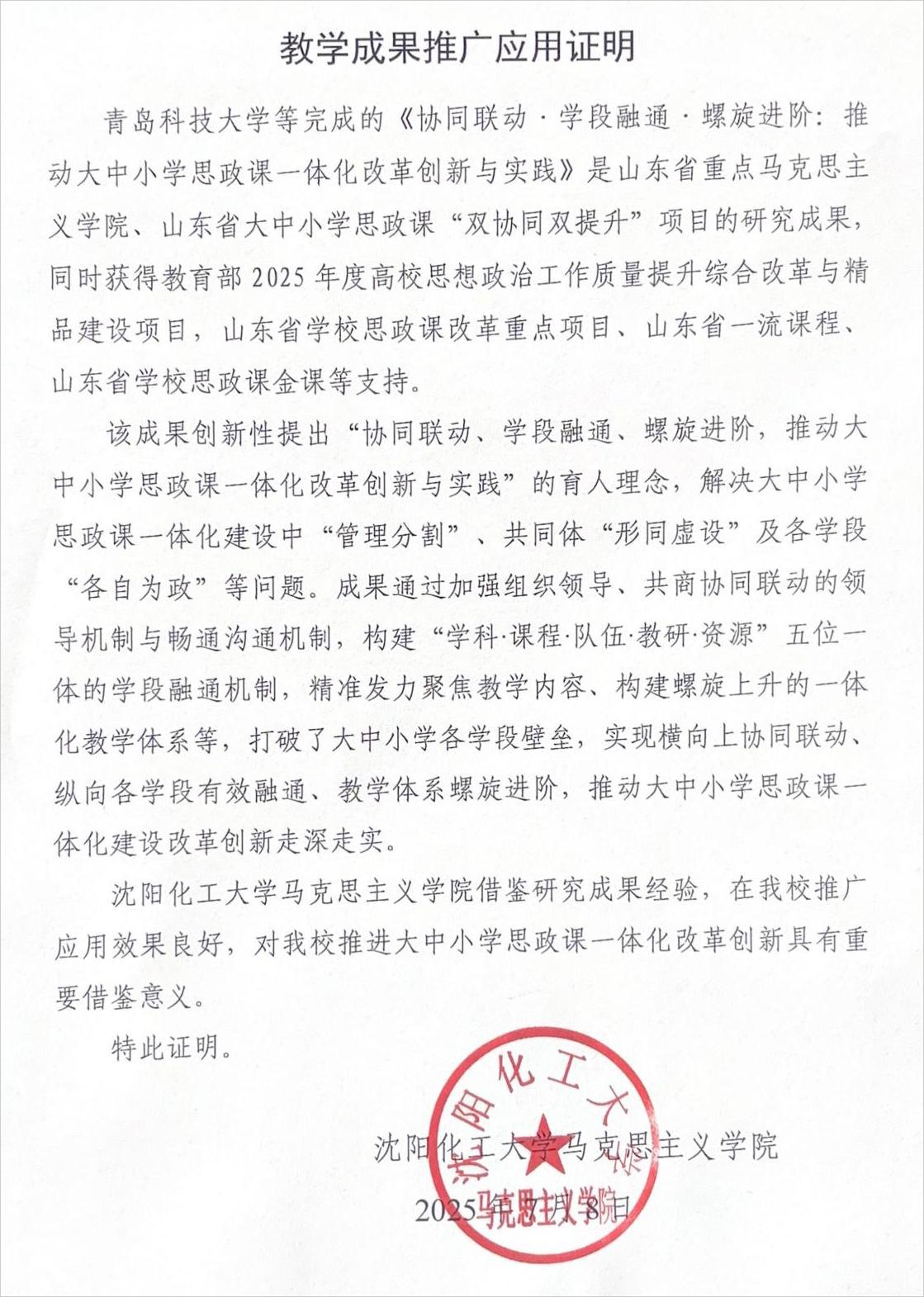 沈阳化工大学教学成果推广应用证明
