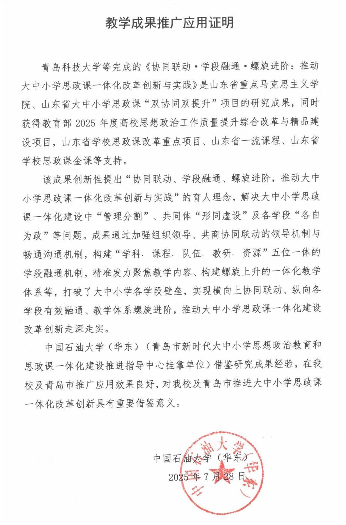 中国石油大学(华东)教学成果推广应用证明